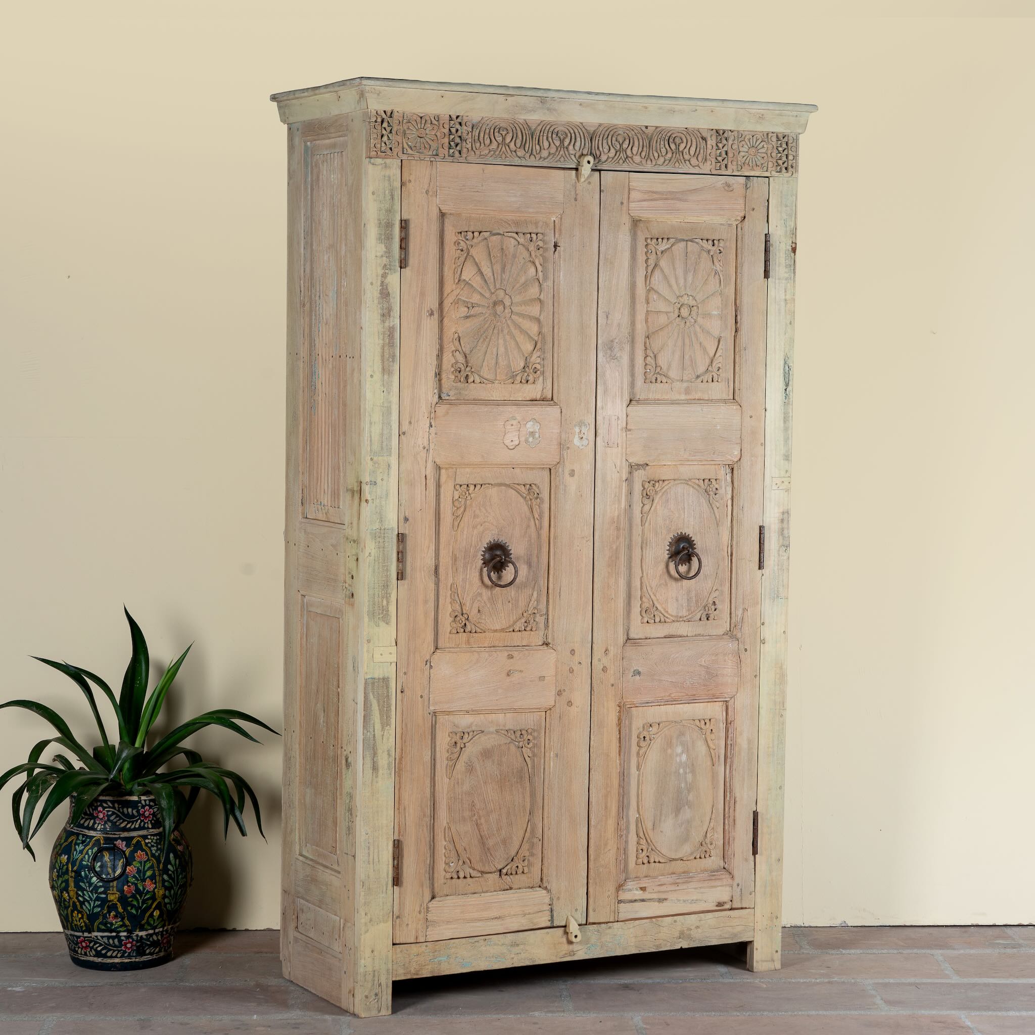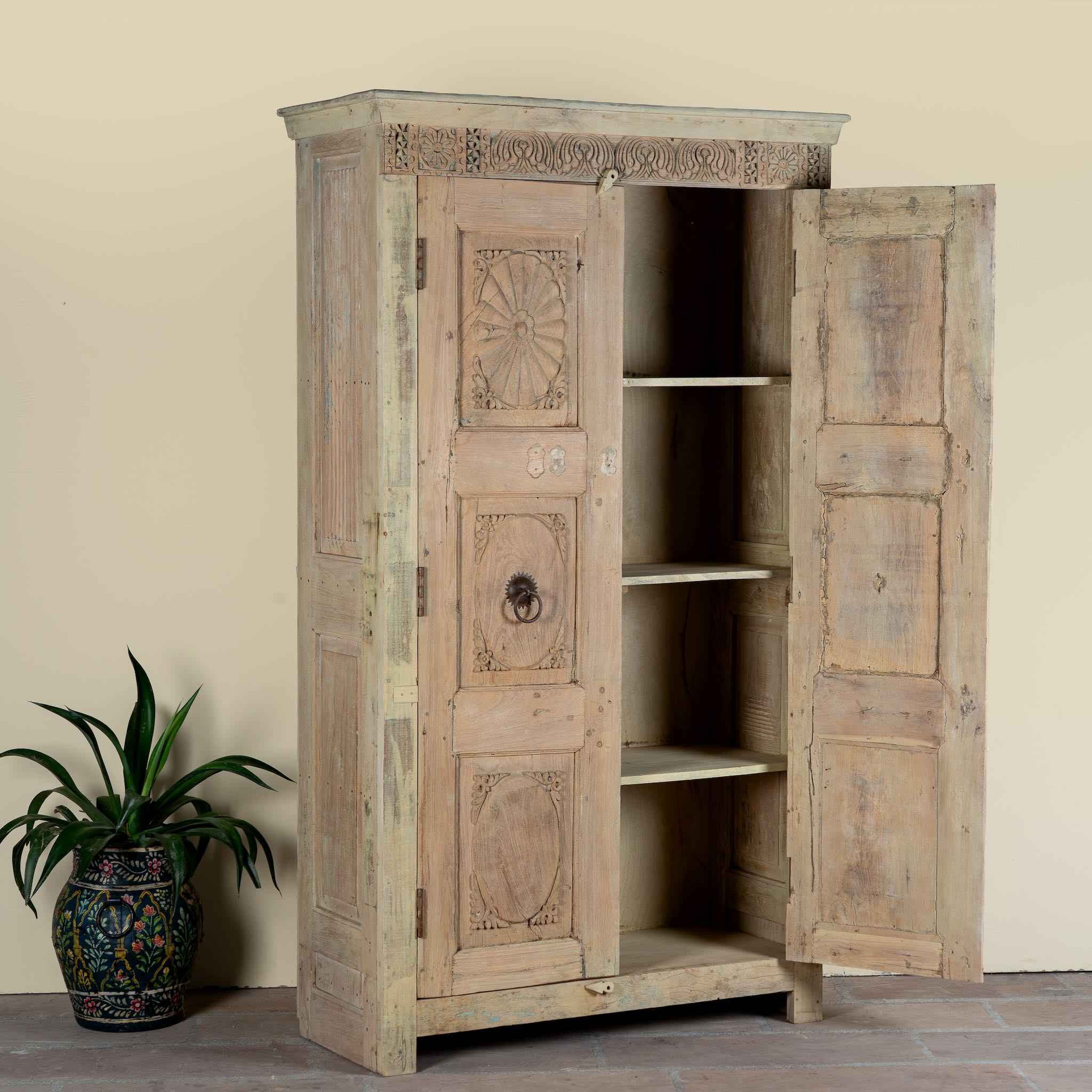 Design: Antique Indian door used as the front, featuring original hand-carved detailing and iron hardware