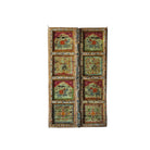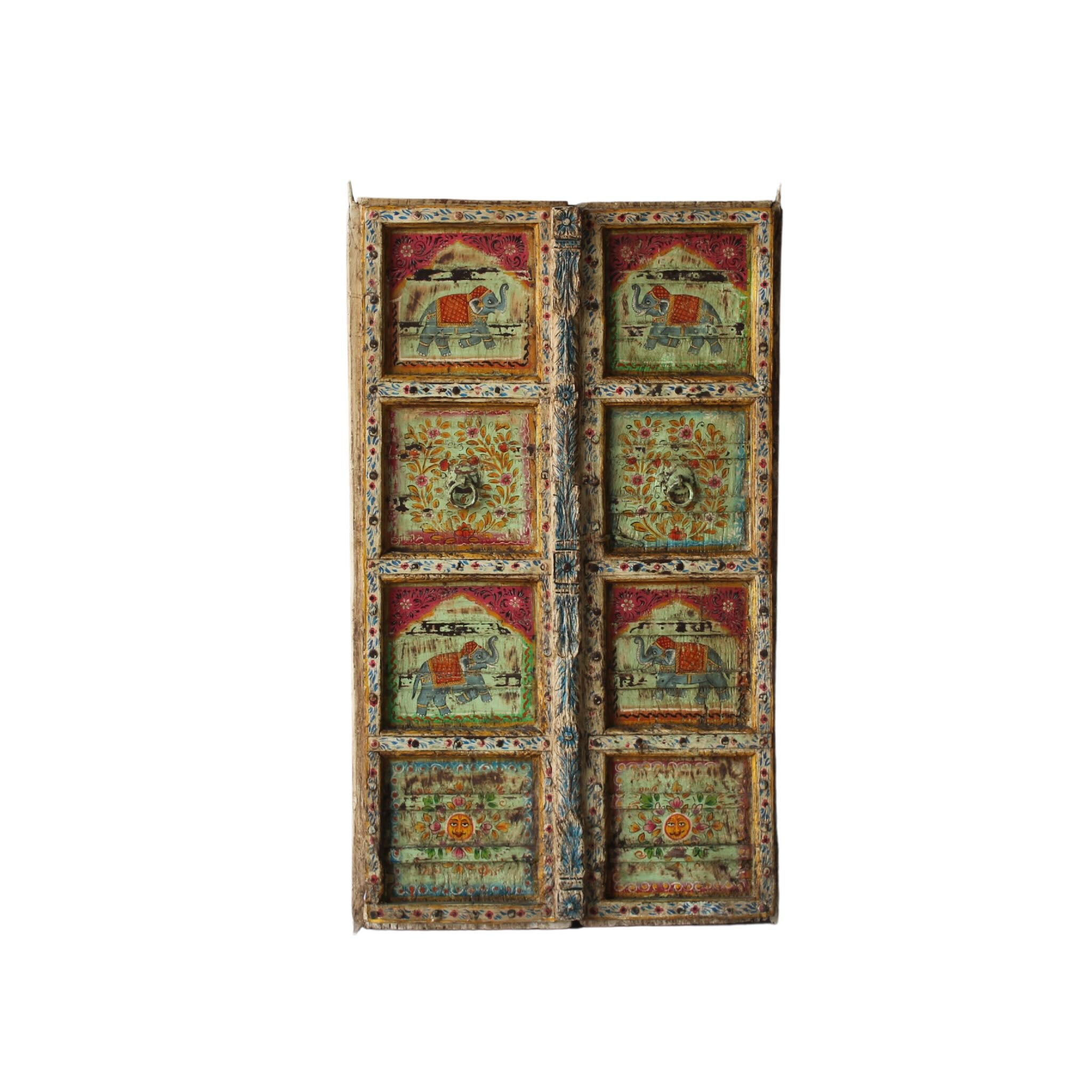 Graceful and full of charm, this Indian antique door brings storytelling and artistry into your home. Handcrafted from reclaimed solid teak wood, it features alternating hand-painted panels of regal elephants beneath arched canopies, interwoven with floral and vine motifs. The richly detailed frames are both carved and painted, enhancing its cultural depth and visual rhythm.