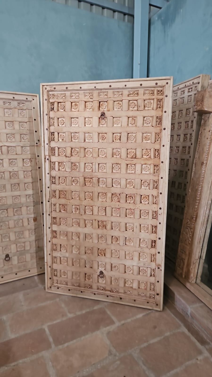 Hand-carved floral motifs are arranged in a symmetrical panel layout, reflecting the timeless artistry of old Indian door furniture. The aged teak wood, finished in a soft whitewashed tone, brings warmth and character while preserving the architectural soul of its origin.