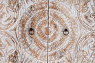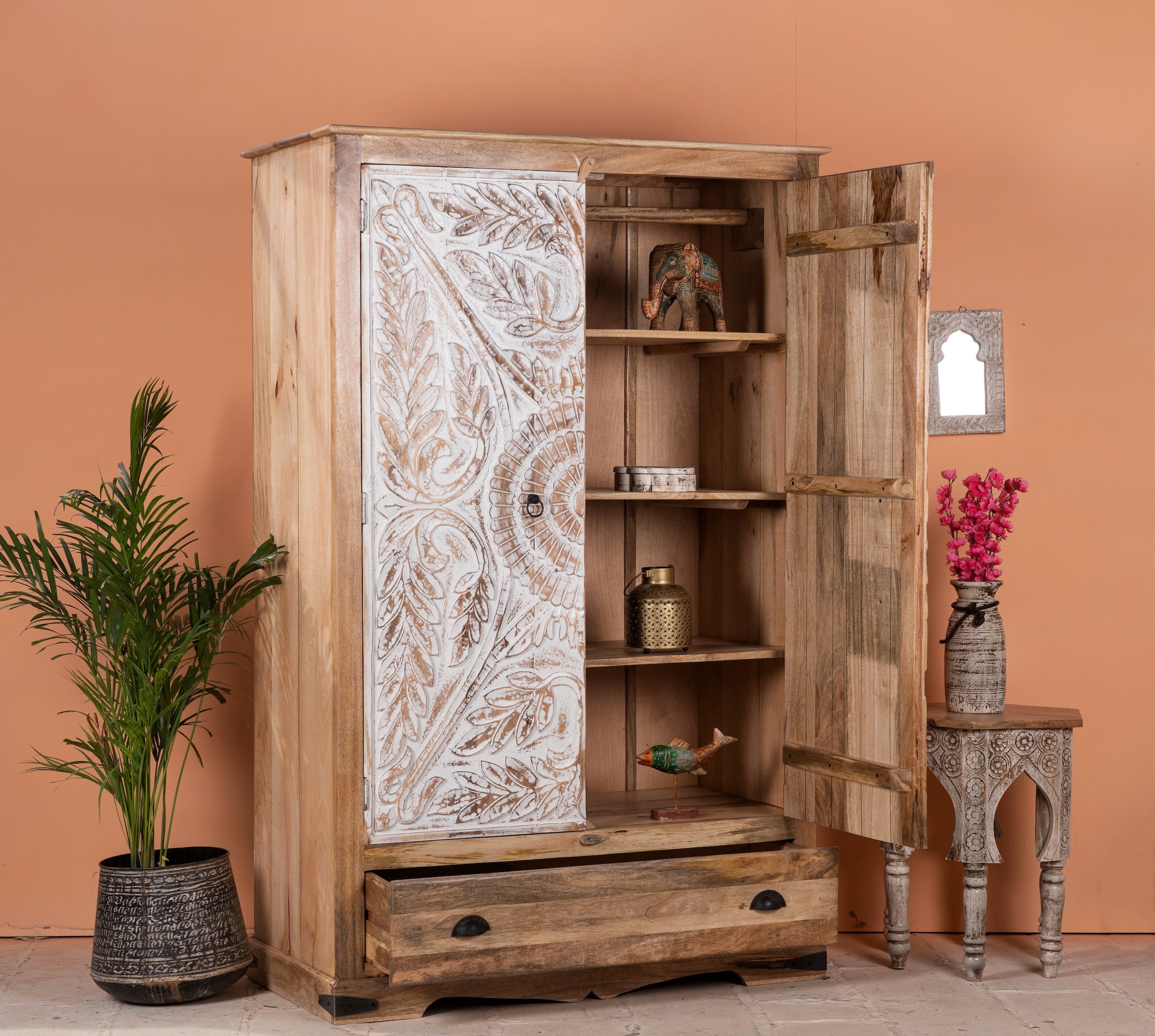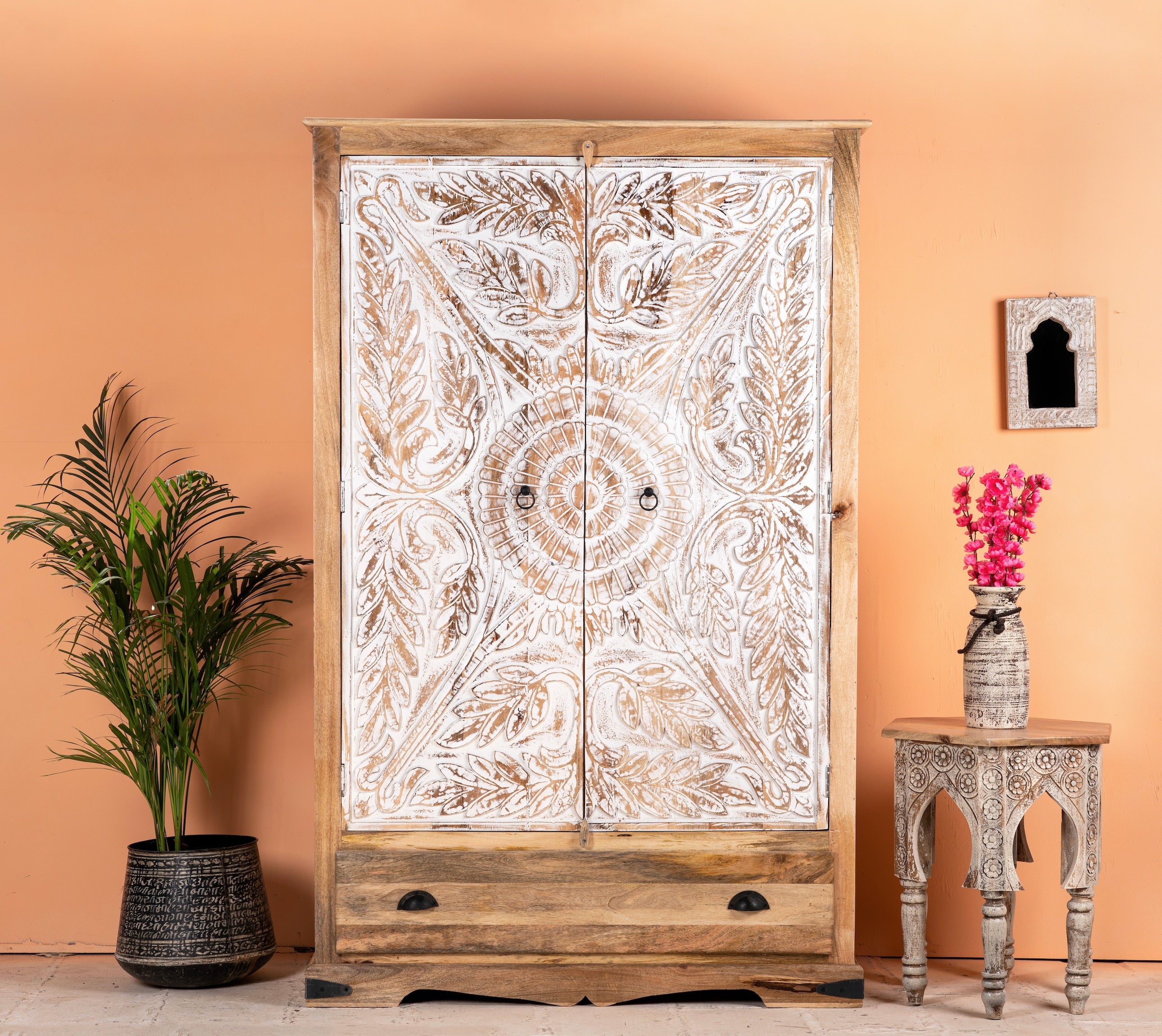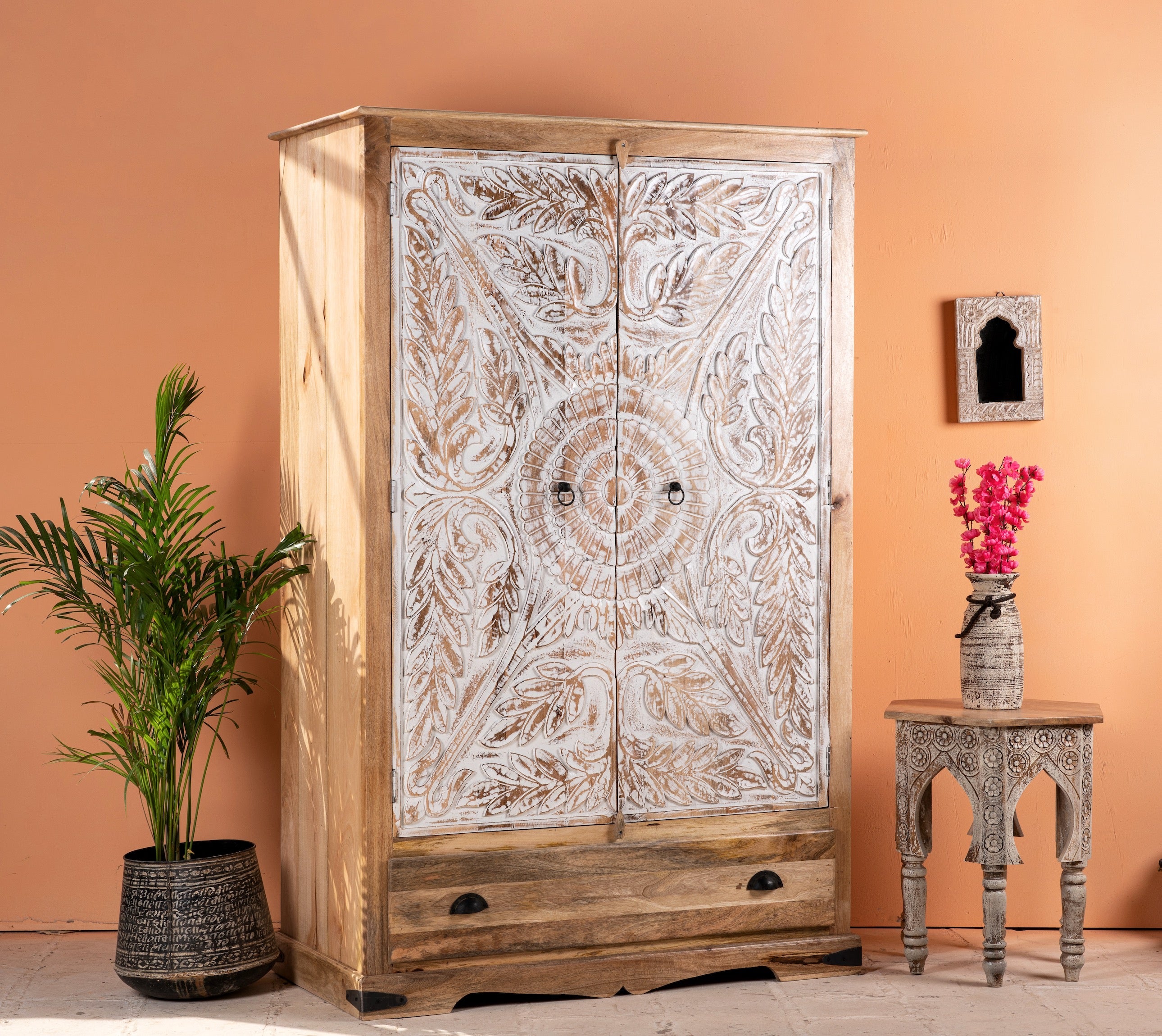Verwandeln Sie Ihren Wohnraum mit dem Charme des handgefertigten Schranks „Cheyyur“, bei dem künstlerische Handwerkskunst auf Funktionalität trifft.