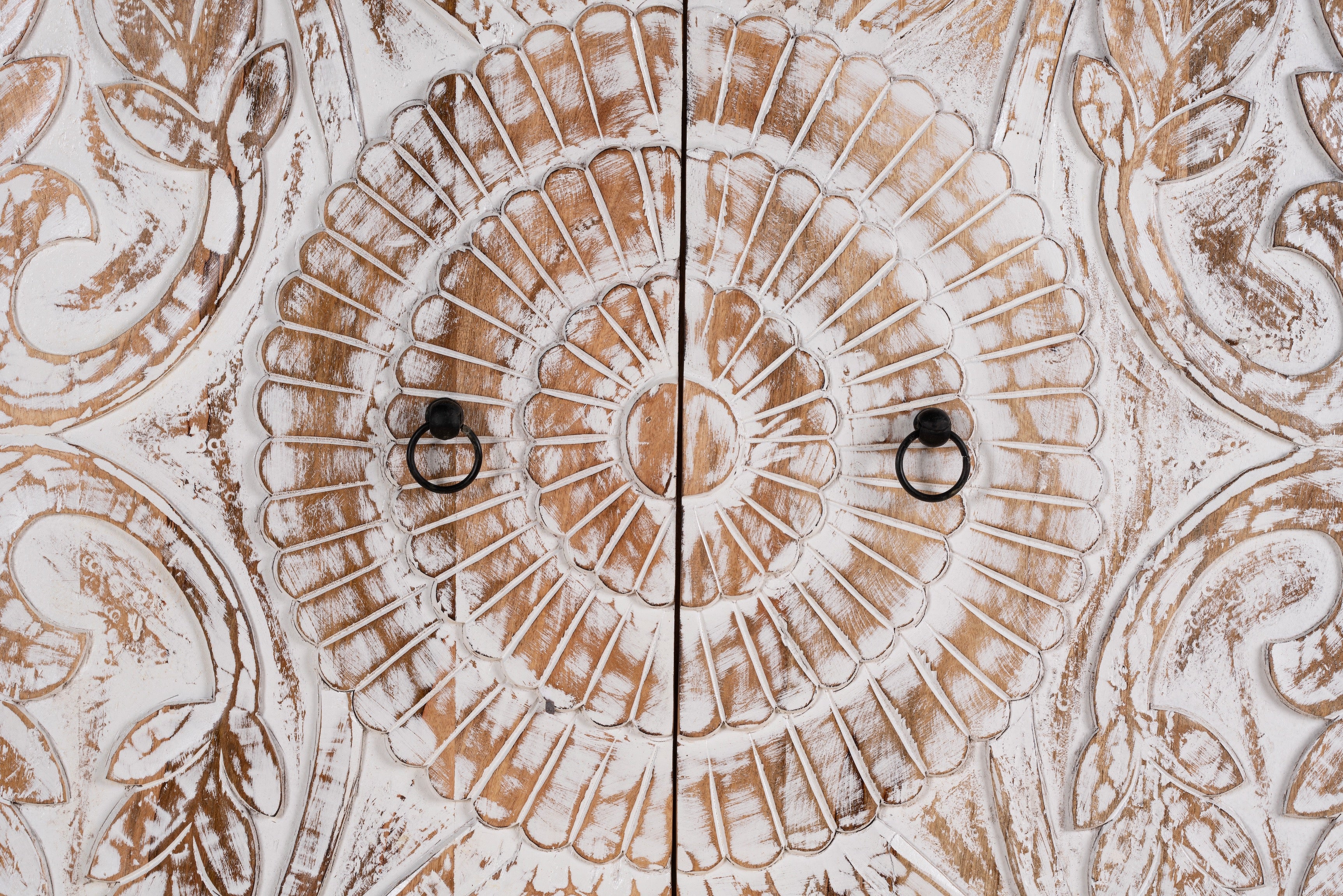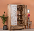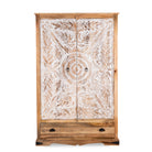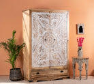 Erleben Sie die exquisite Handwerkskunst des handgefertigten indischen Schranks „Cheyyur“, ein wahres Meisterwerk, das Eleganz und Funktionalität mühelos vereint. Die Erhabenheit dieses Stücks wird durch seine großen weiß getünchten Türen definiert, die mit aufwendigen handgeschnitzten Gravuren verziert sind und das Können und die Kunstfertigkeit indischer Handwerker zur Schau stellen.