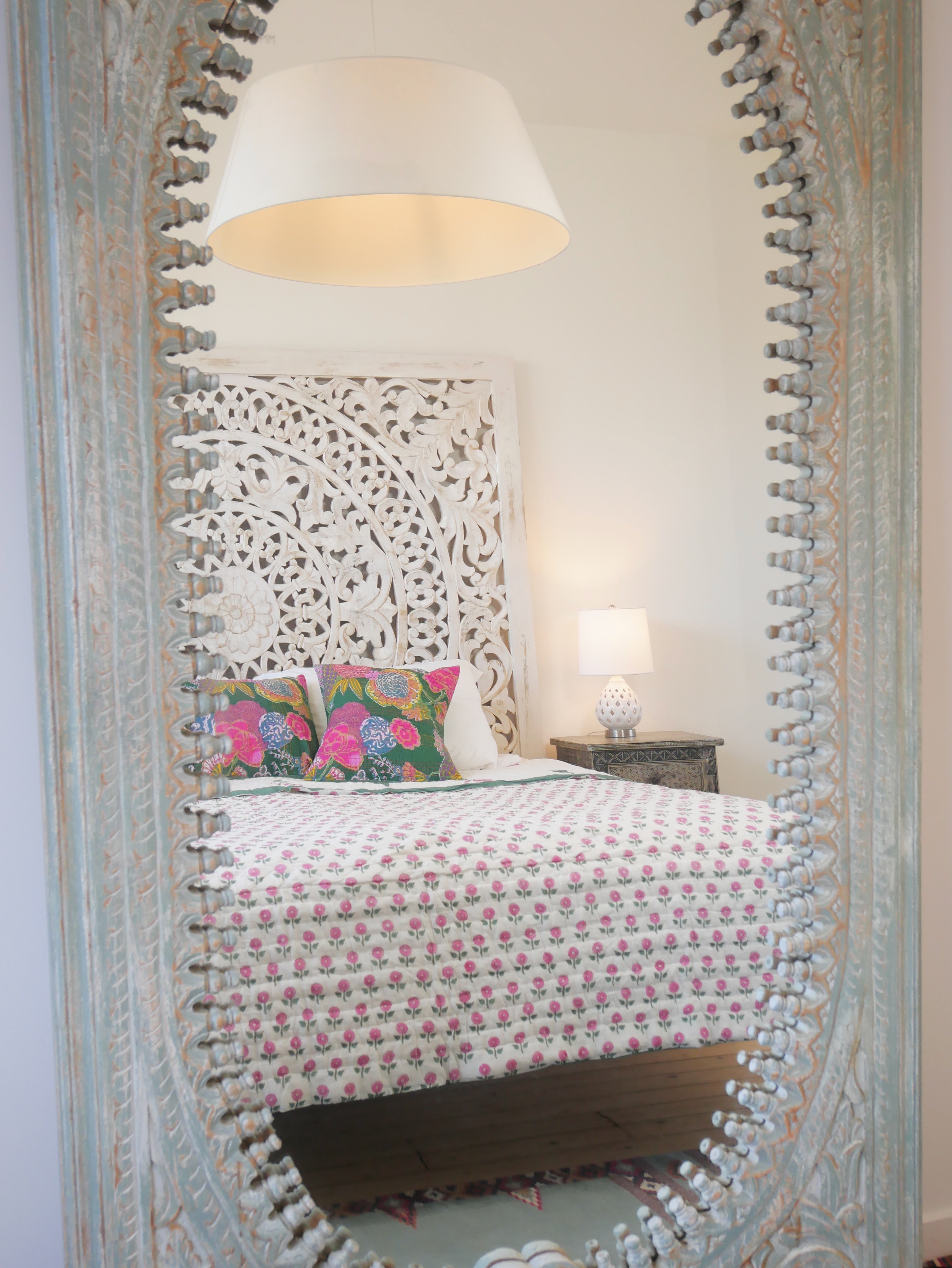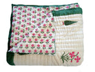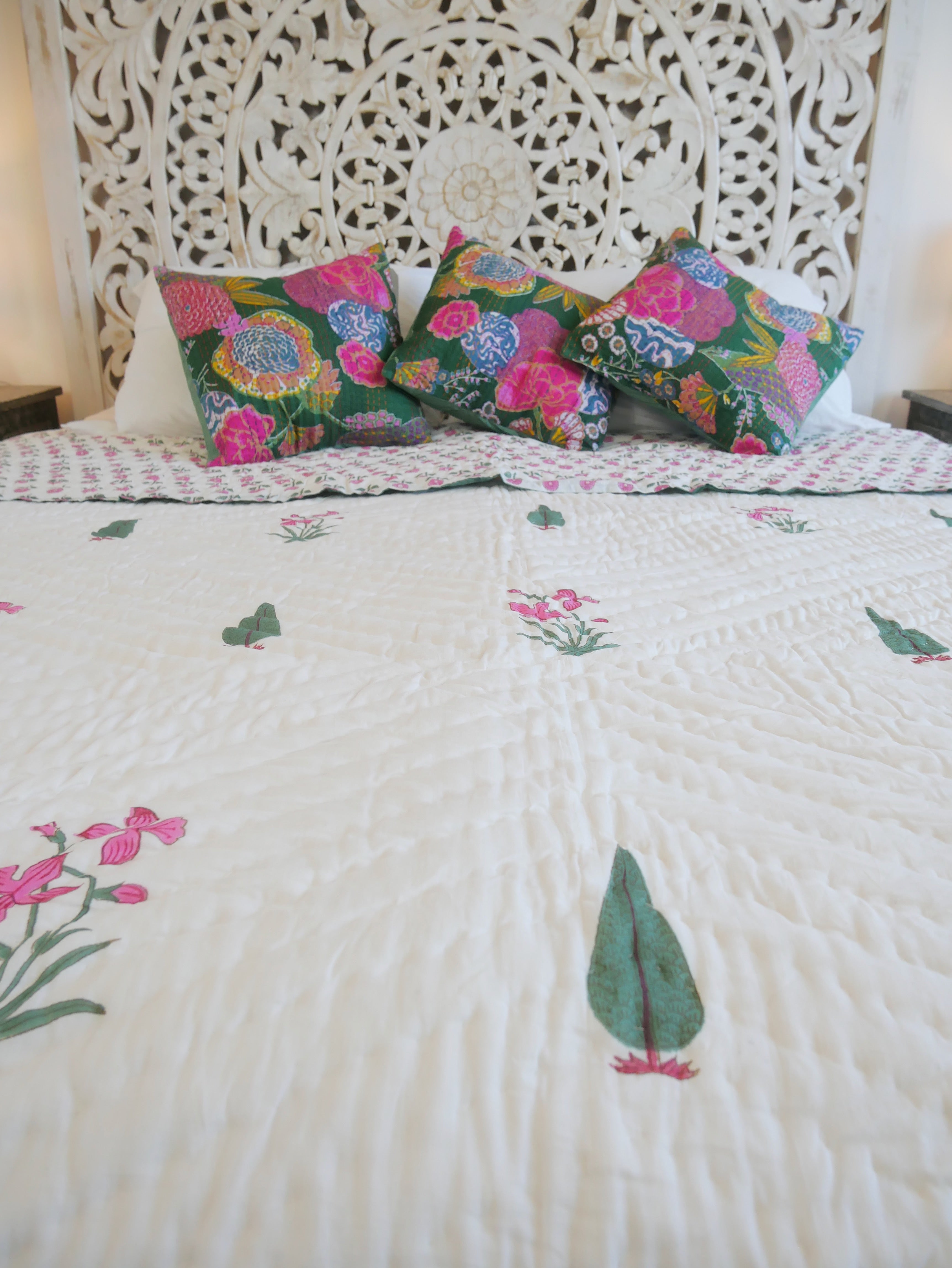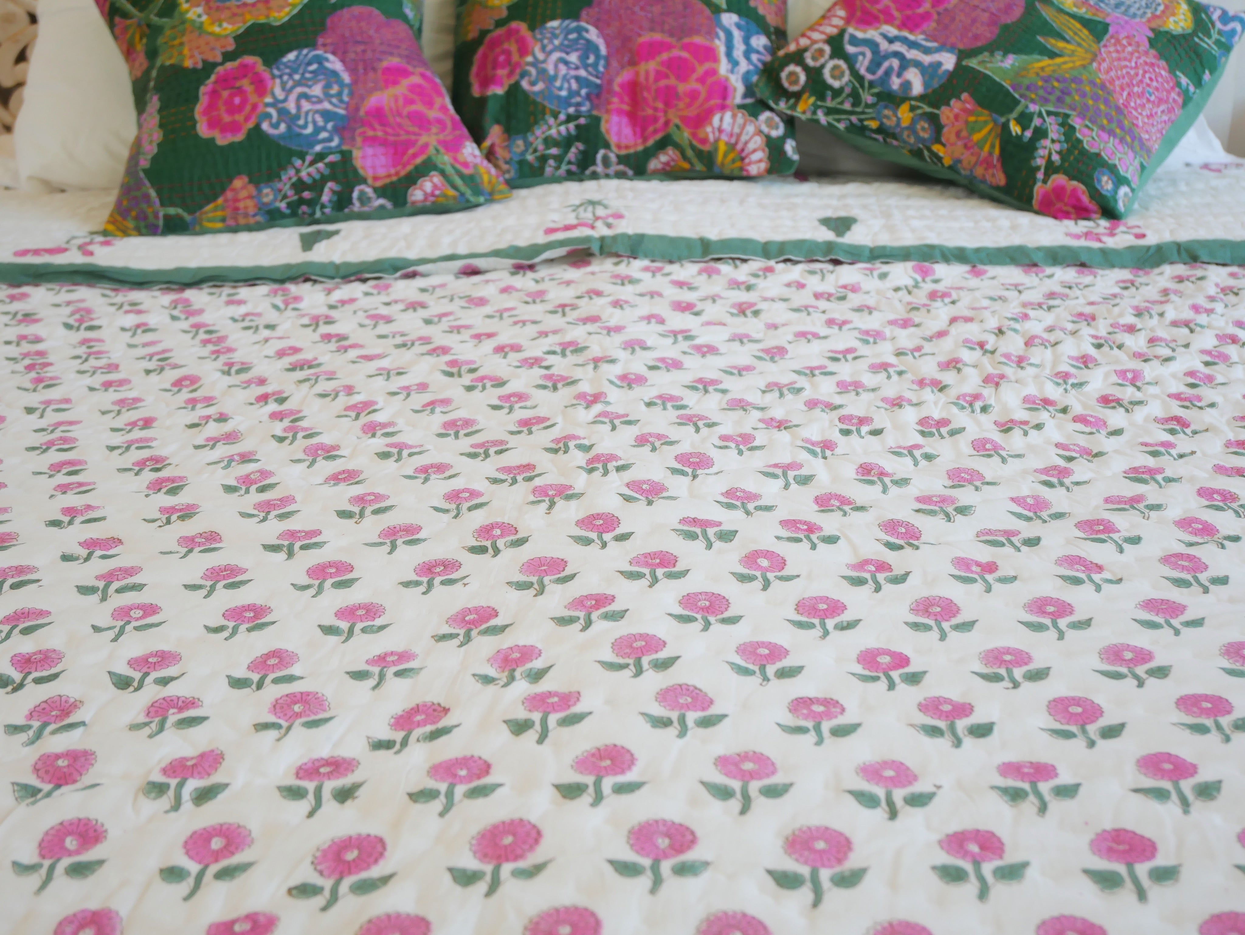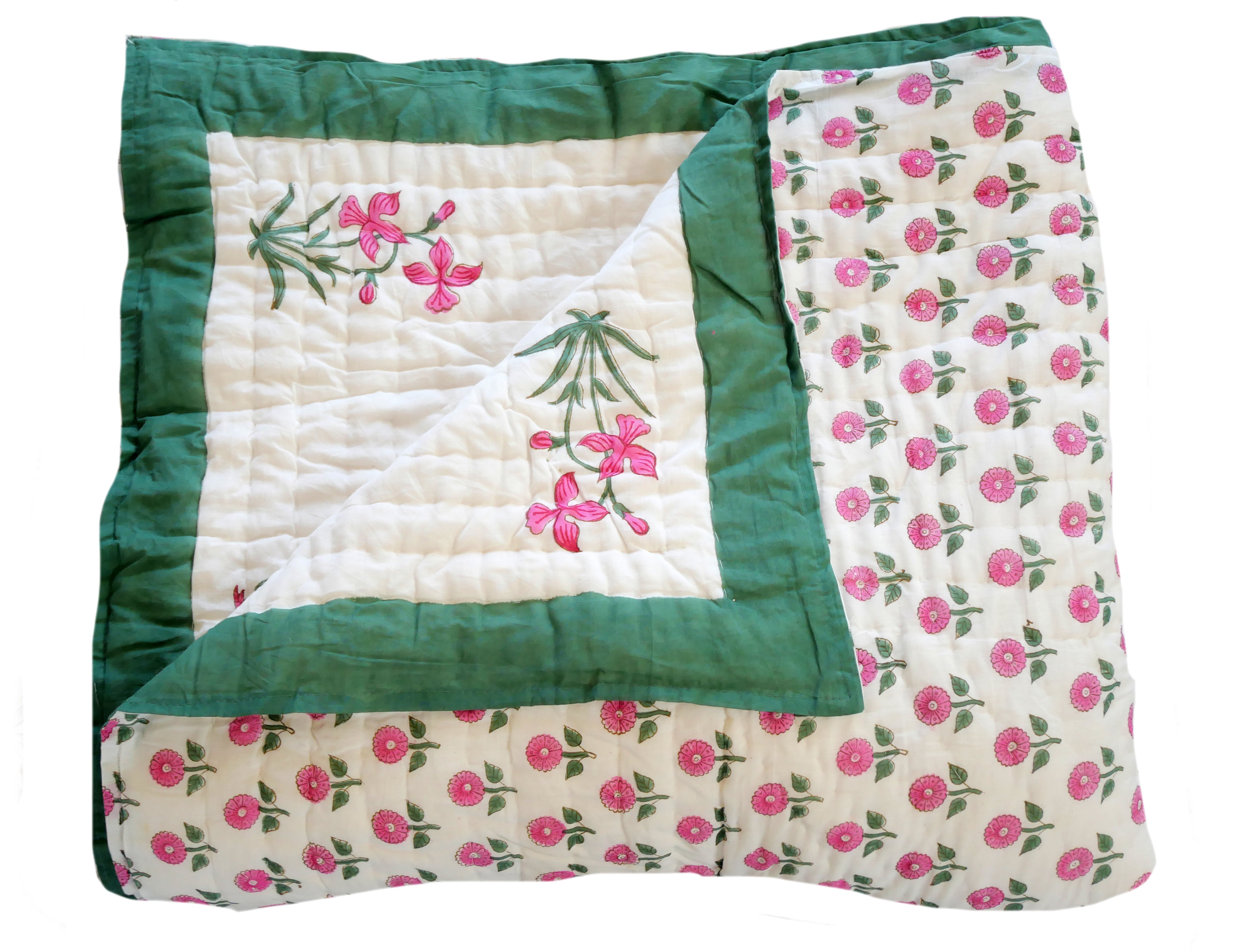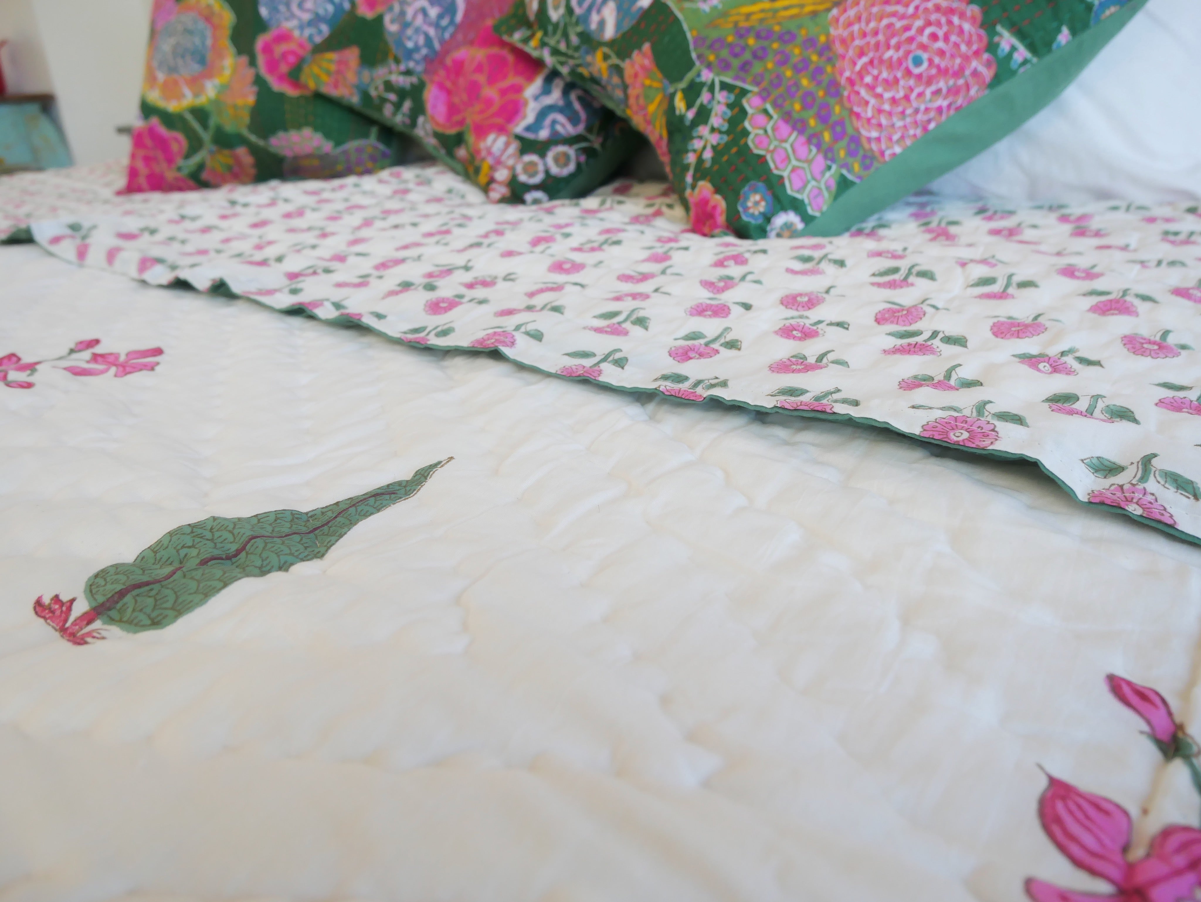 Es ist beidseitig im Handblockverfahren mit verschiedenen Mustern in typischen Designs aus Rajasthan bedruckt und kann daher gewendet werden, wie auf unseren Fotos zu sehen.