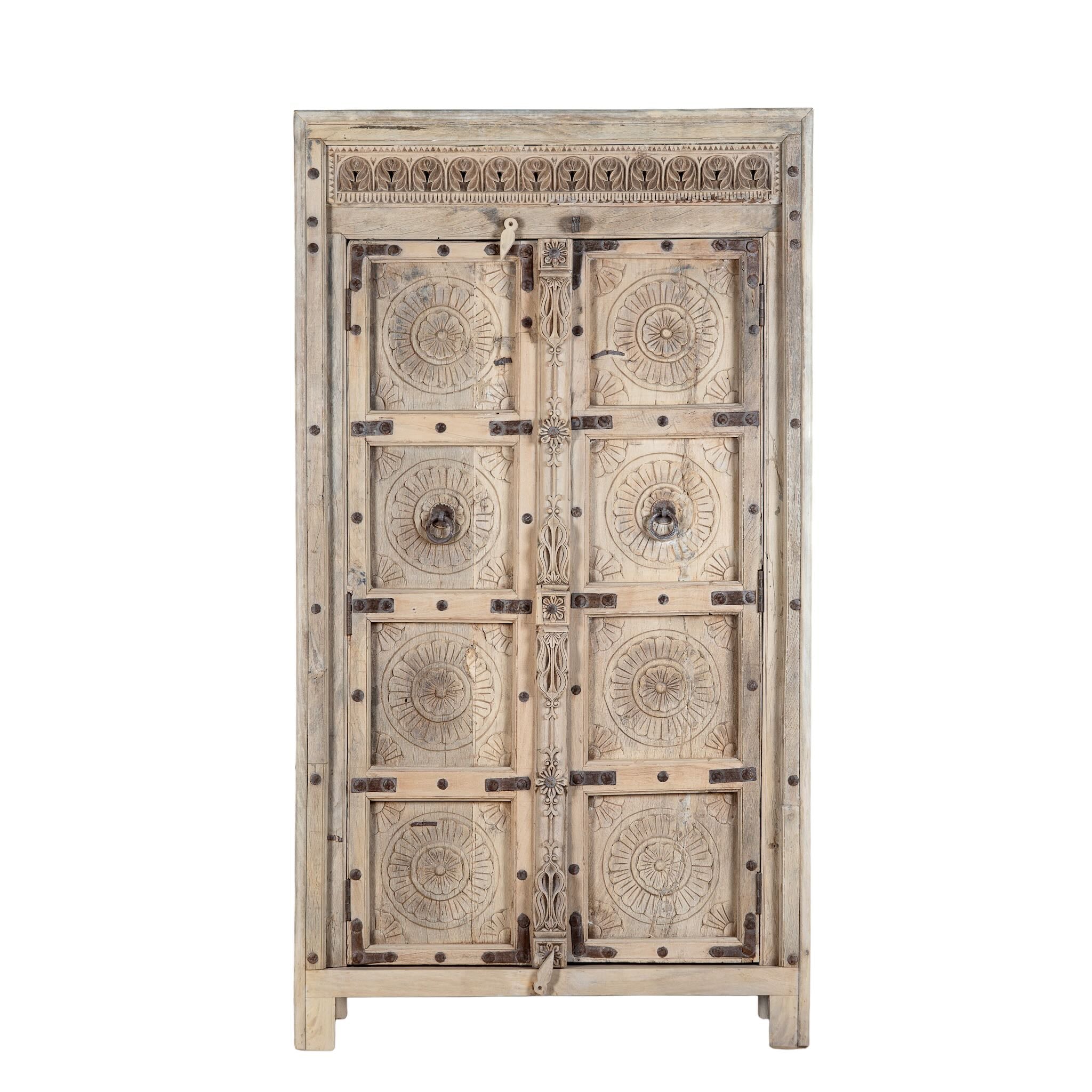 Design: Front crafted from an original Indian door with hand-carved motifs and iron details