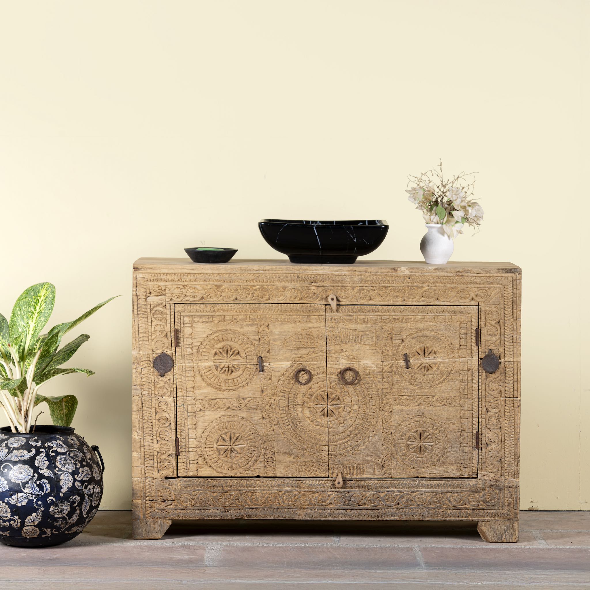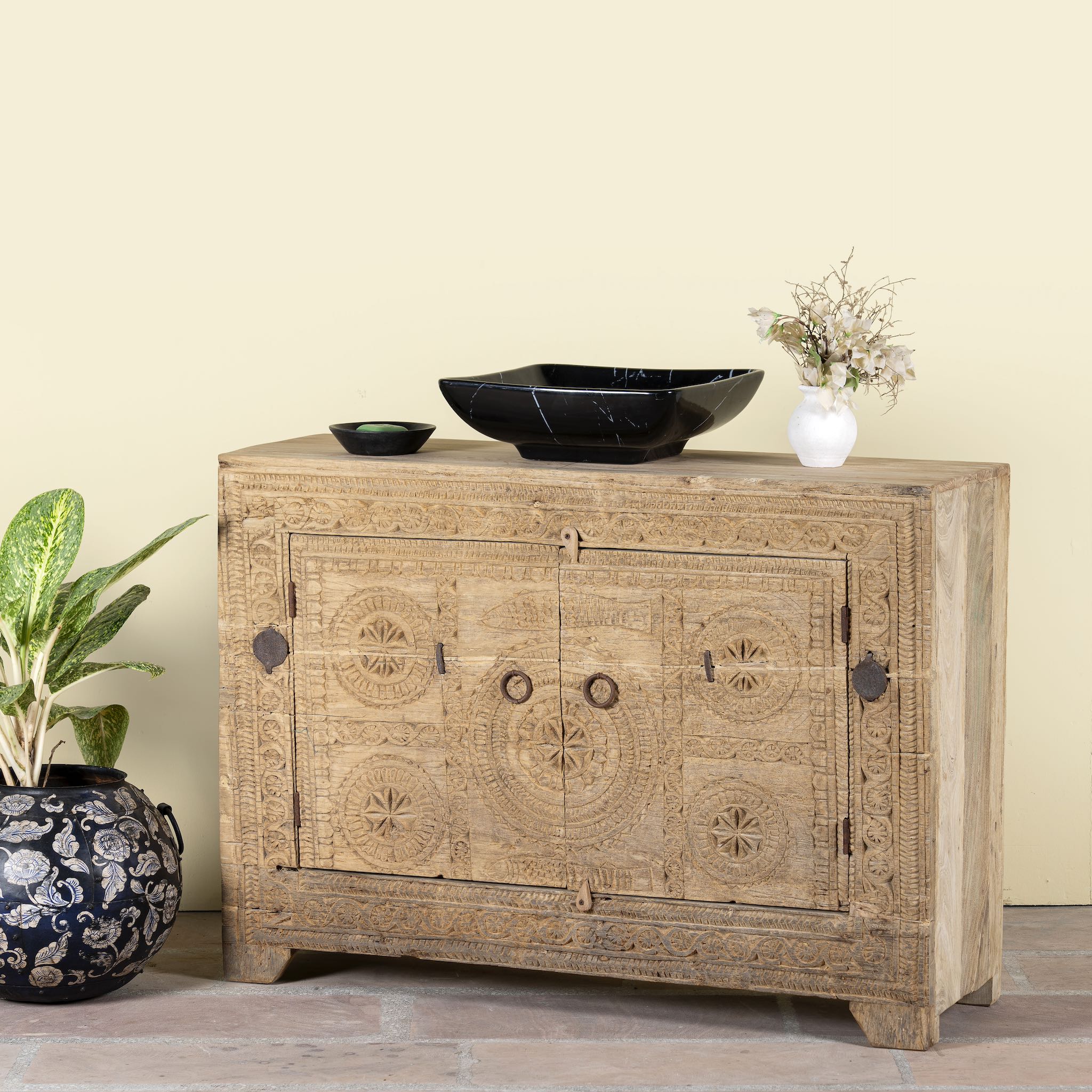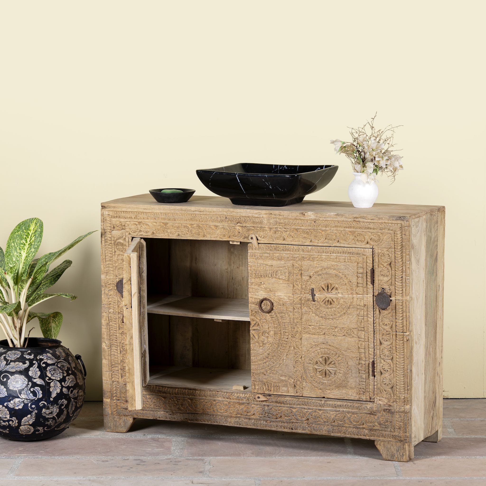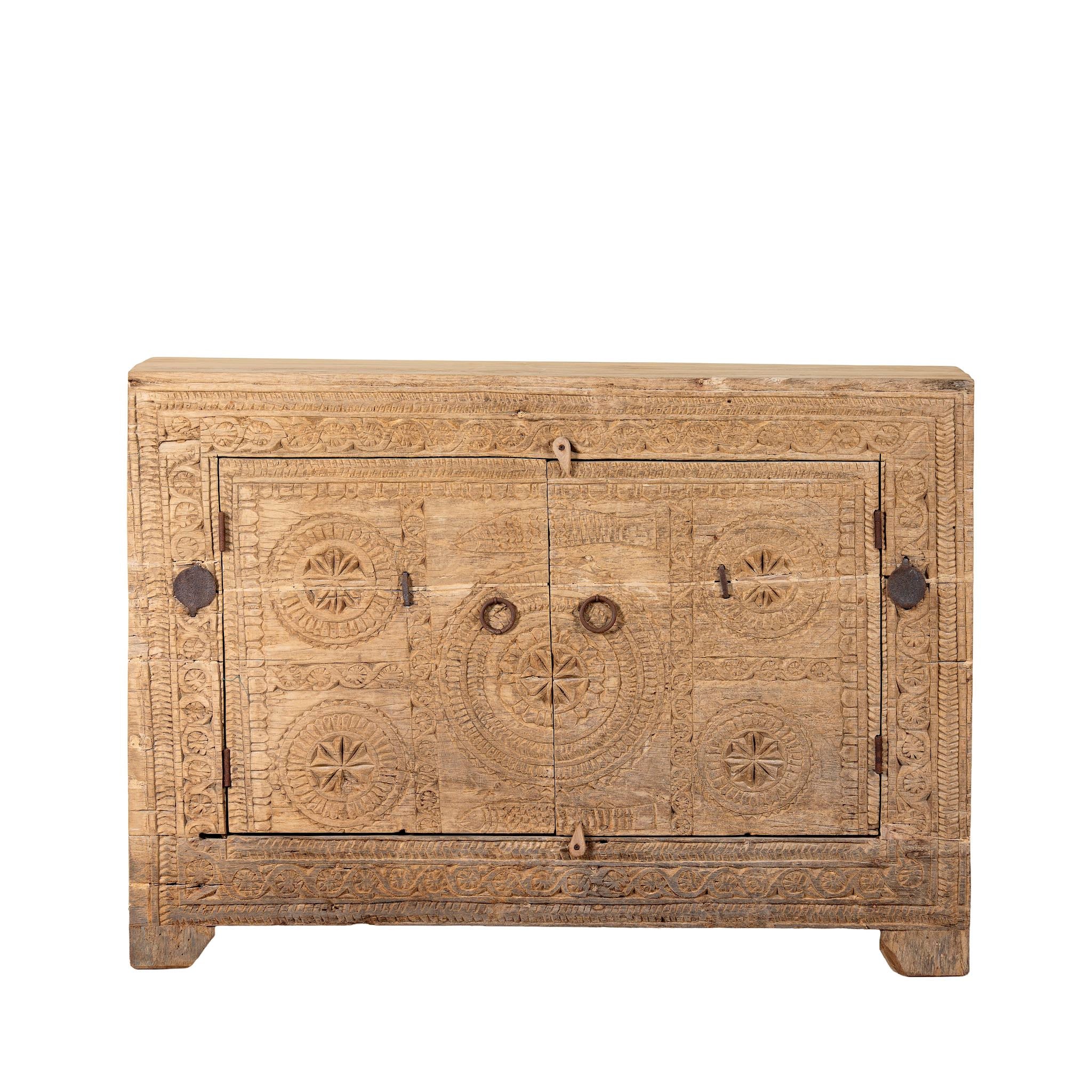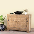 The weathered teak surfaces display timeworn details and organic imperfections, making each piece one-of-a-kind. Behind its beautifully carved doors, the sideboard offers practical storage, perfect for organising tableware, linens, or bathroom essentials while adding a touch of rustic Mediterranean charm.
