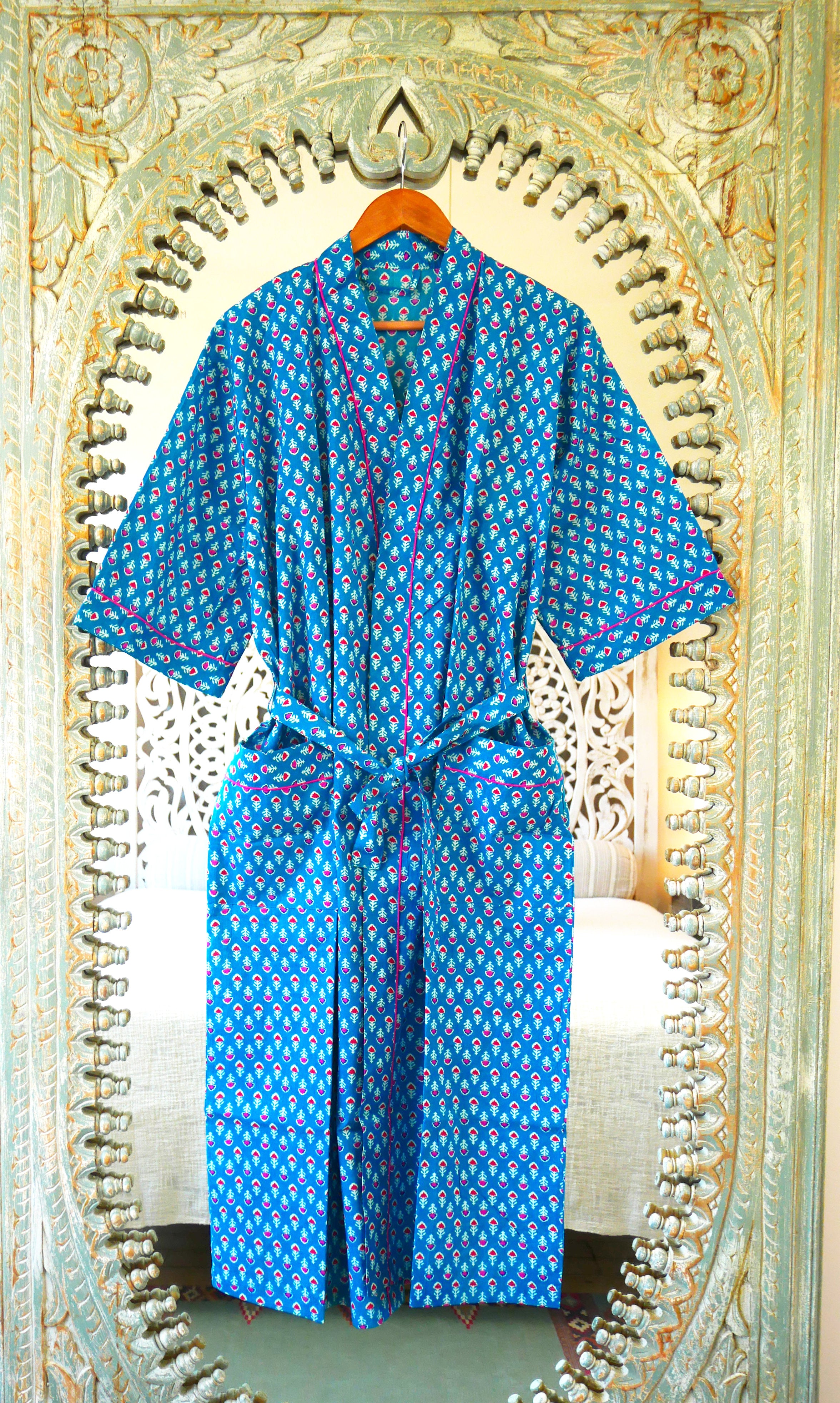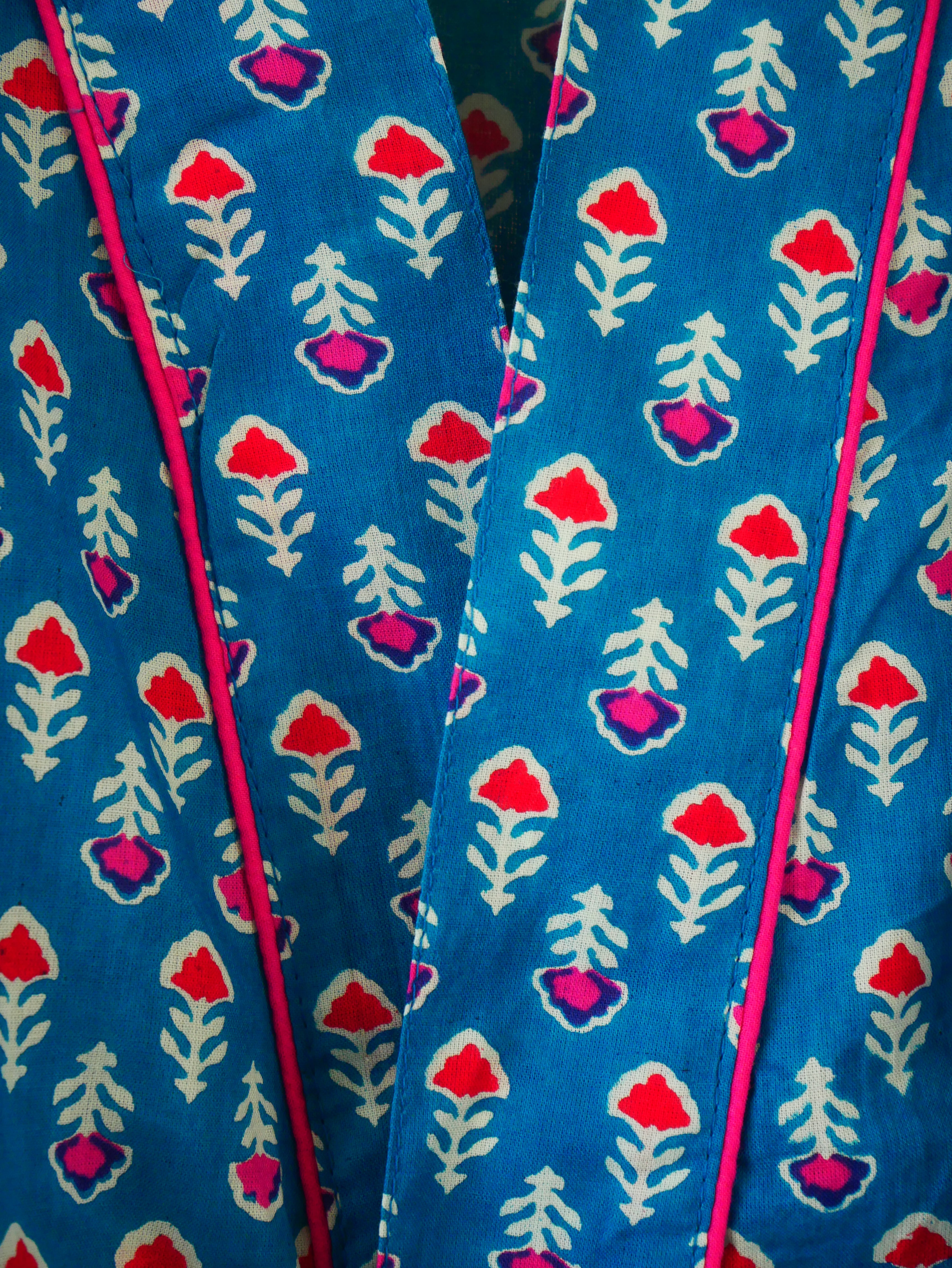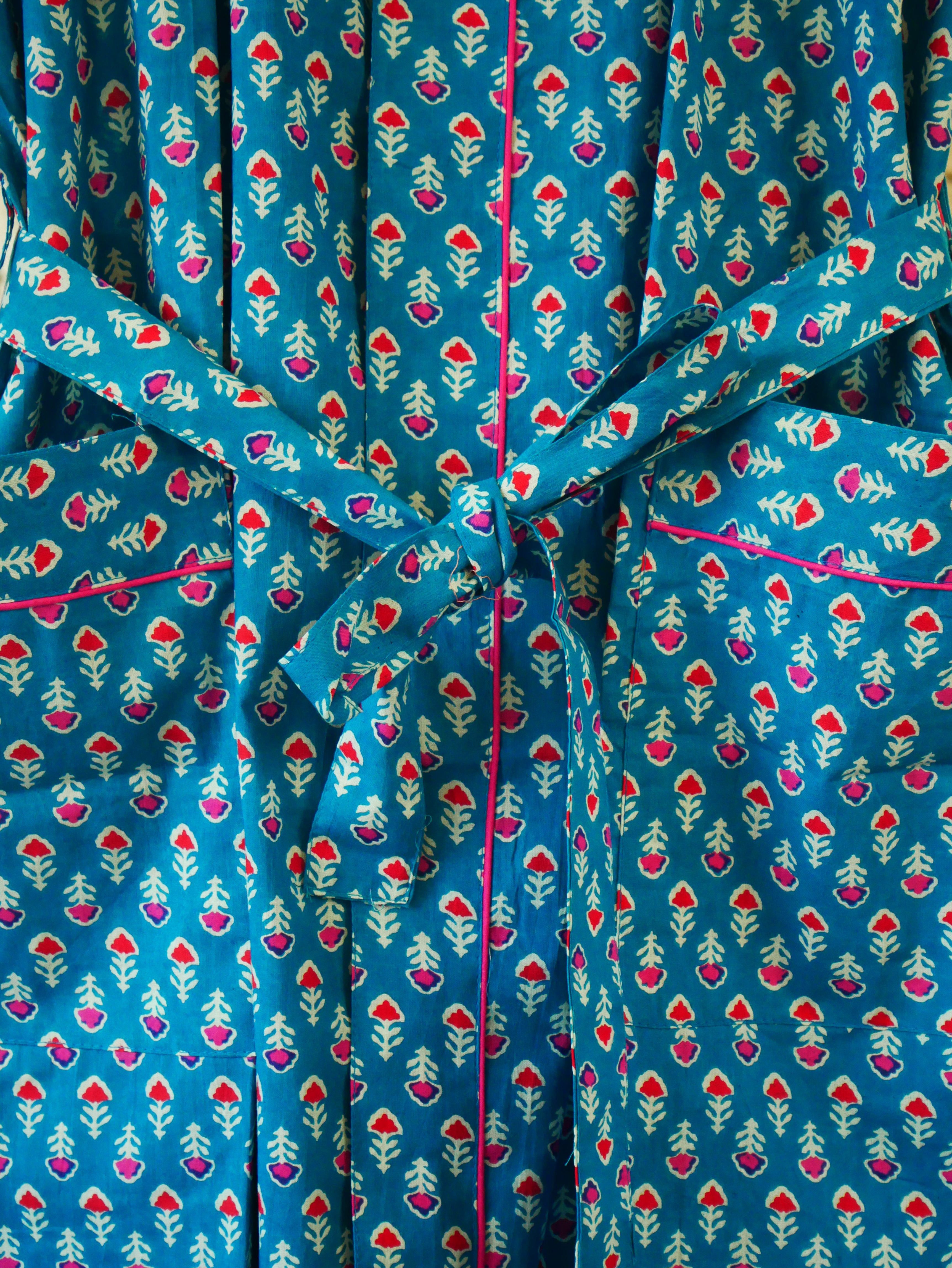 Hüllen Sie sich in die lebendige Schönheit unserer Morgenmäntel, die nach unseren Designs in Jaipur aus 100 % Baumwolle gefertigt werden. Jeder Mantel präsentiert sich in einer Vielzahl von Farben und Designs, die traditionelle Muster aus Rajasthan mit modernen Blumenmotiven verbinden. Diese Mäntel sind nicht nur ein Zeugnis außergewöhnlicher Handwerkskunst, sondern auch eine Feier des kulturellen Erbes und des zeitgenössischen Stils. Ideal zum Entspannen oder um Ihrer Morgenroutine eine exotische Note zu verleihen, versprechen unsere Morgenmäntel Komfort und Eleganz in jedem Detail
