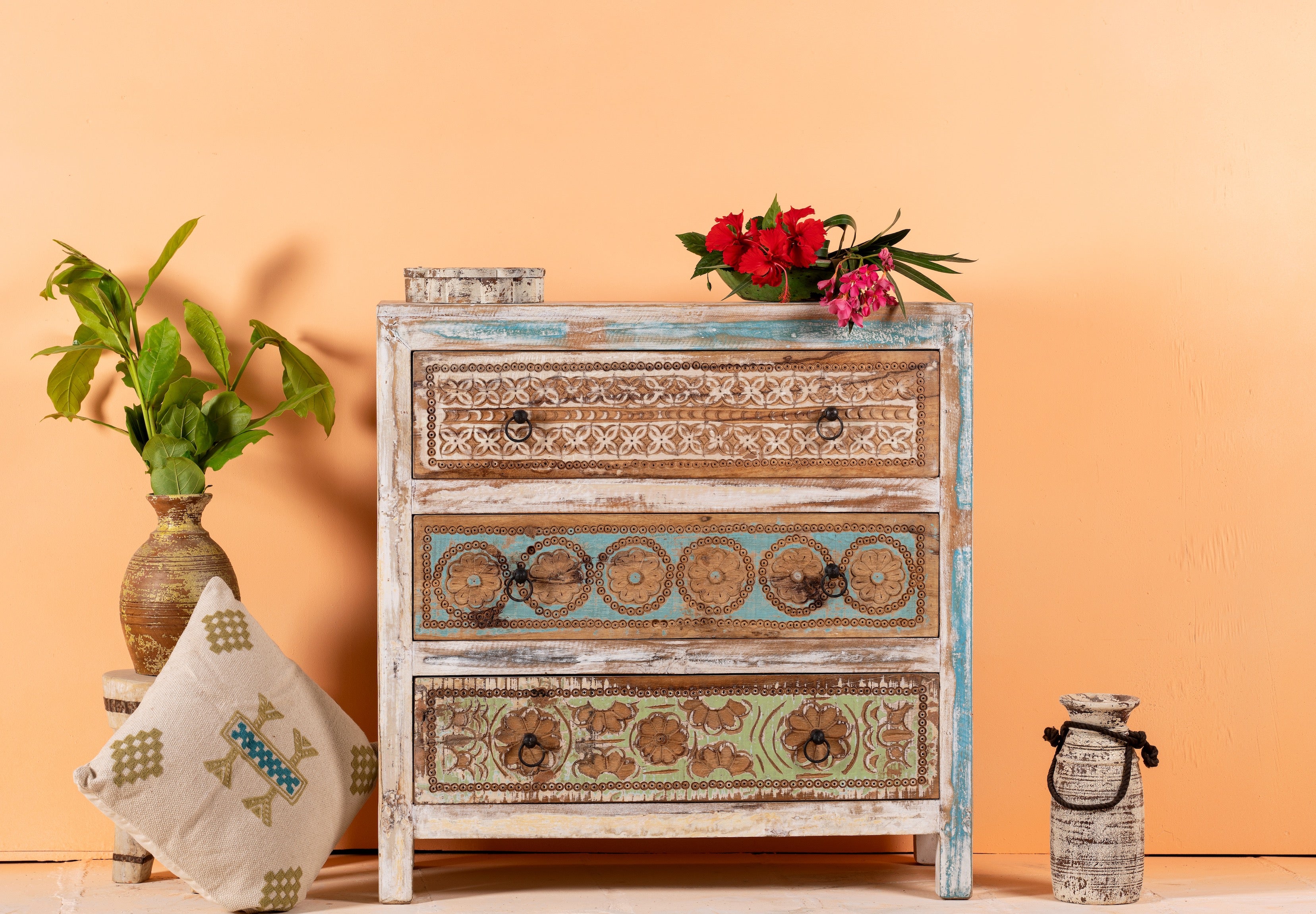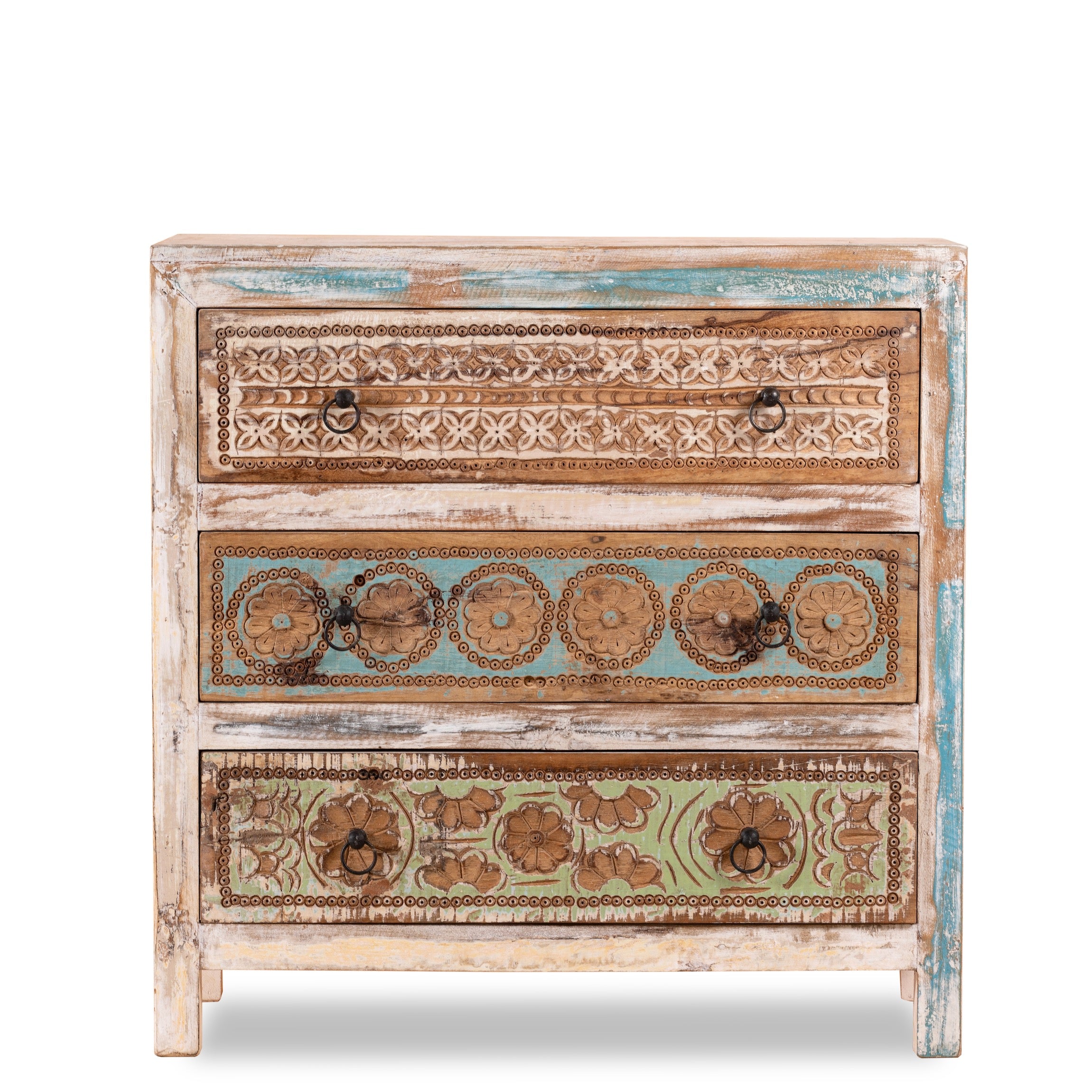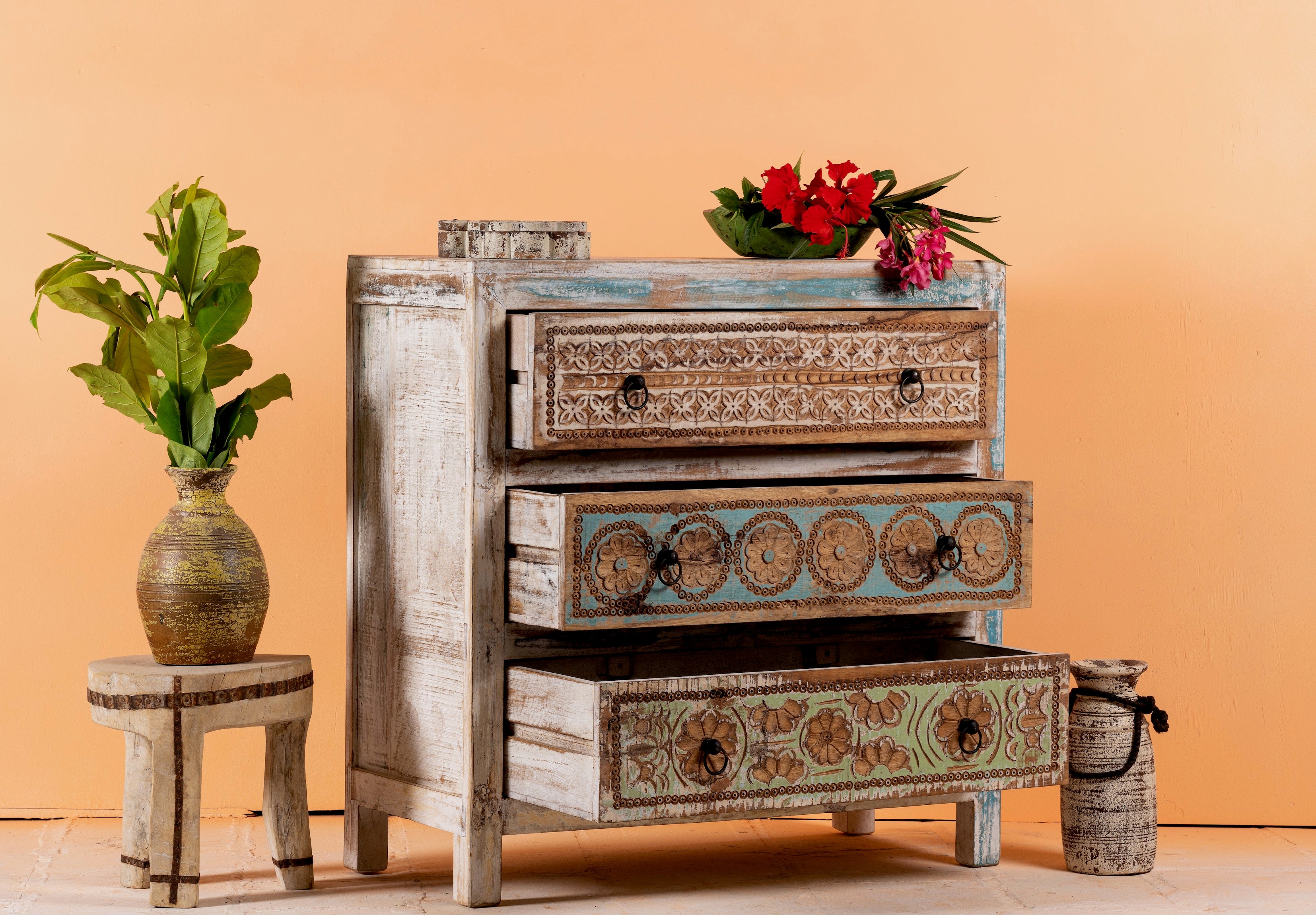 Wir stellen vor „Sasan Gir“, eine bemerkenswerte handgefertigte indische Kommode, die Funktionalität mit künstlerischer Brillanz verbindet. Dieses mit Sorgfalt und Präzision gefertigte Stück zeigt das reiche Erbe indischer Handwerkskunst.
