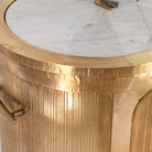 Dieser auffällige Barwagen Vallari aus natürlichem Mangoholz mit Goldfinish ist durchgehend mit edlen Messingakzenten verziert. Sein schlankes, geradliniges Design und die graue Marmorplatte verleihen diesem stilvollen Möbelstück einen Hauch von Raffinesse.