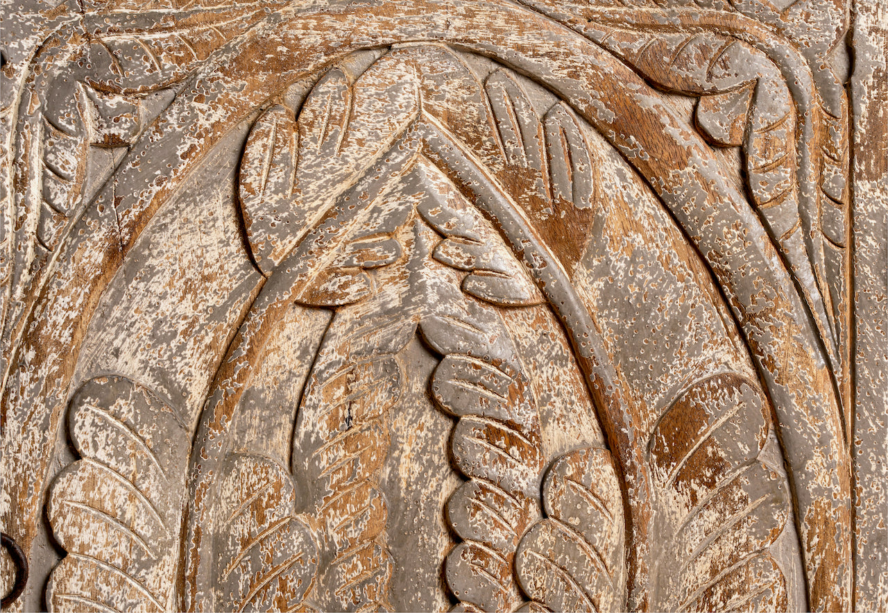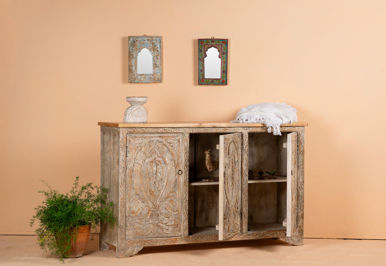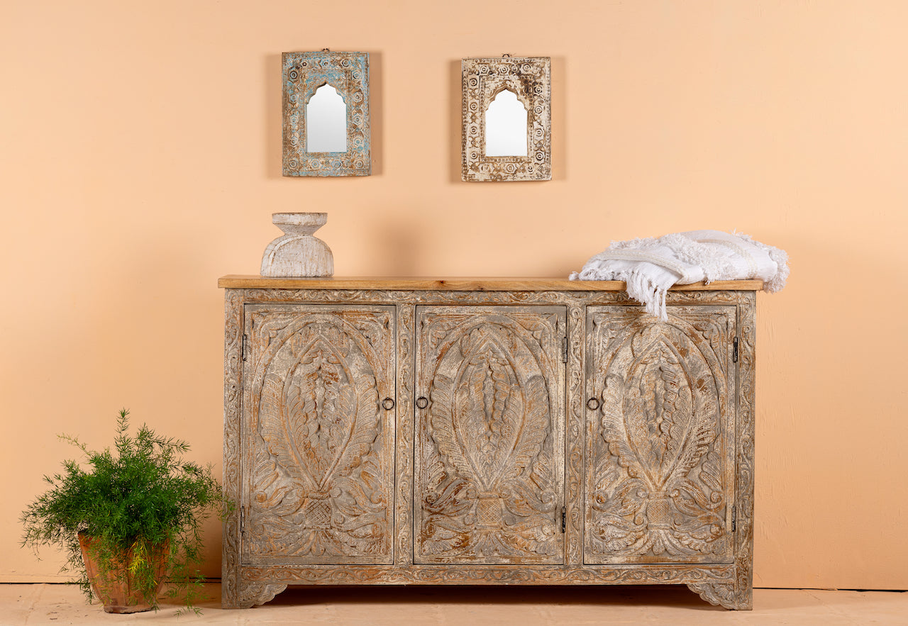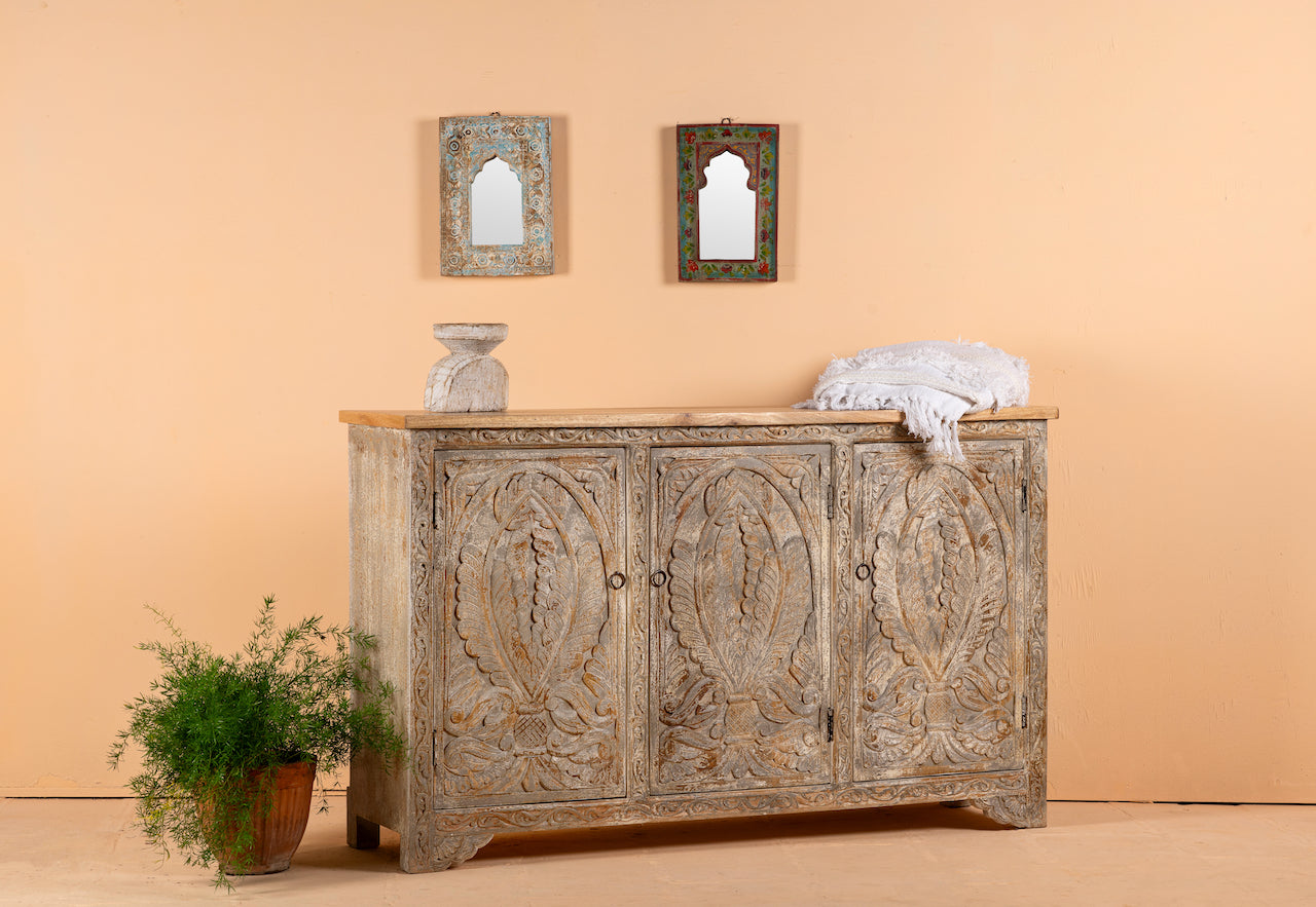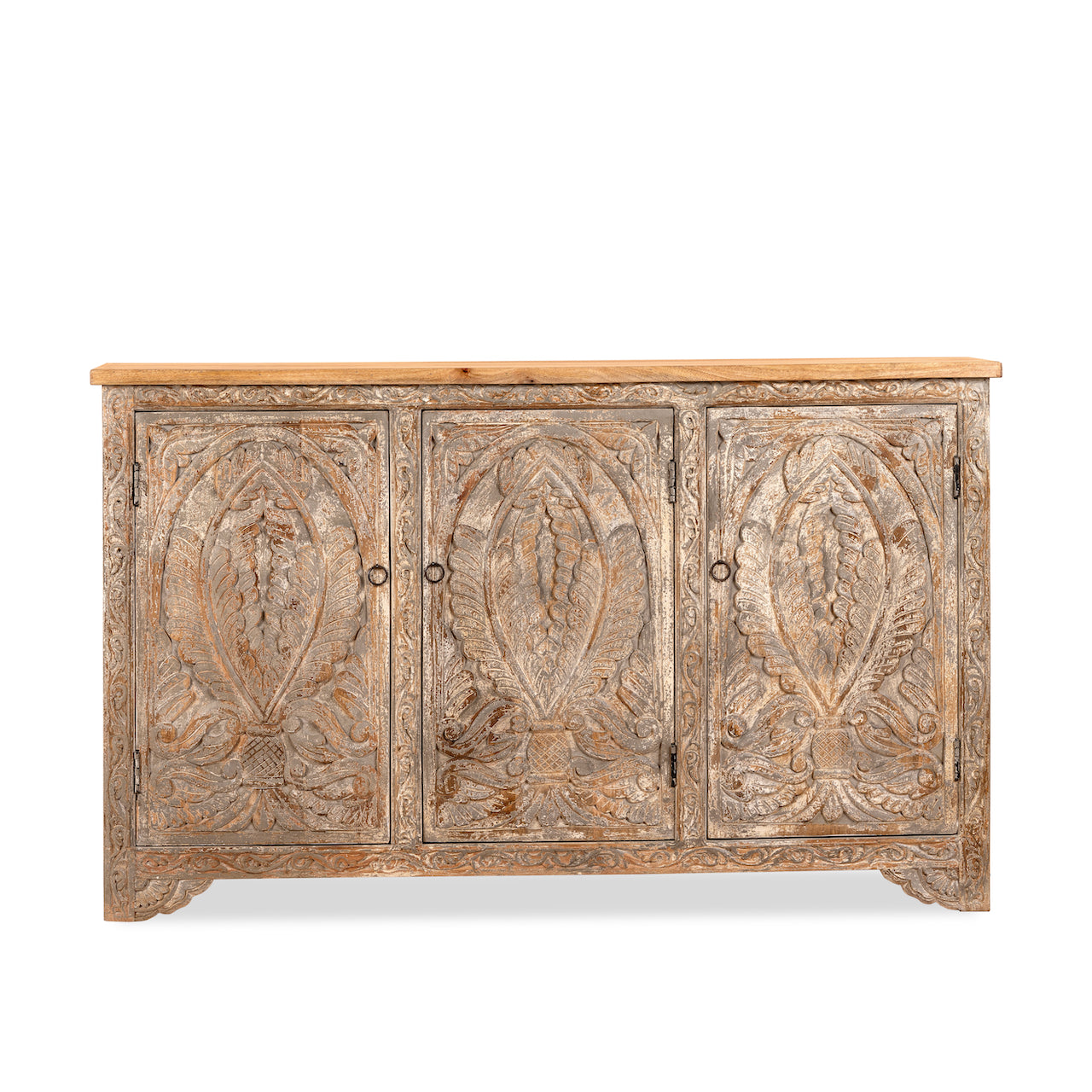 Dieses elegante, handgeschnitzte Sideboard aus Mangoholz ist ein wahres Meisterwerk des Vintage-Designs. Mit seinen aufwendigen floralen Schnitzereien und der raffinierten dreischichtigen Farblackierung strahlt dieses Stück Charme und Charakter aus. Seine robuste Konstruktion und der geräumige dreitürige Stauraum machen es ebenso funktional wie schön und perfekt, um mit seiner zeitlosen Ausstrahlung die Ästhetik jedes Raums zu verbessern.