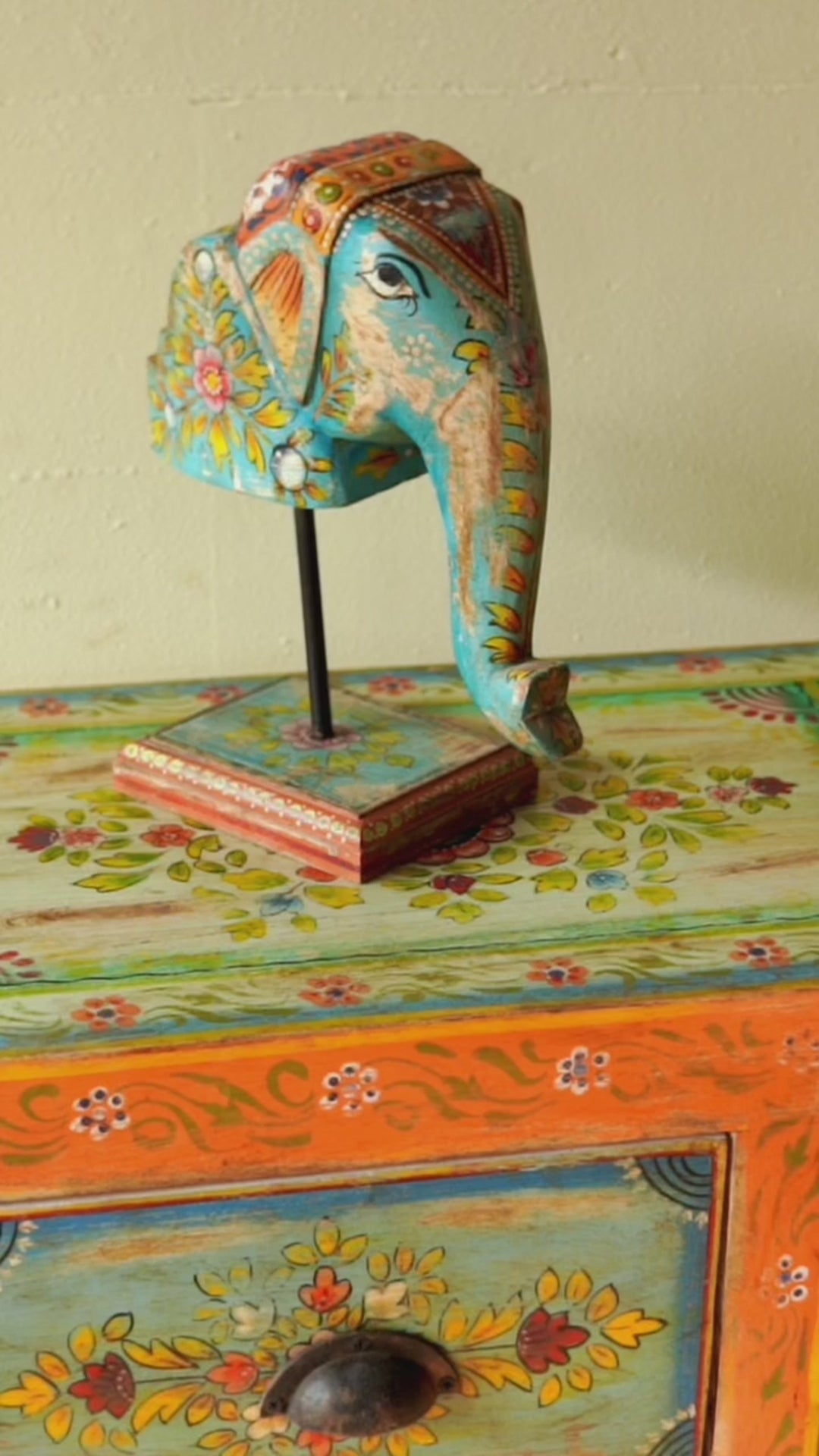 Ausgestattet mit sechs Schubladen und einem geräumigen Schrank verbindet dieses Stück Funktionalität mit künstlerischem Flair. Die robuste Konstruktion aus Mangoholz sorgt für Langlebigkeit, während die detaillierten handgemalten Motive jedes Stück zu einem echten Unikat machen.