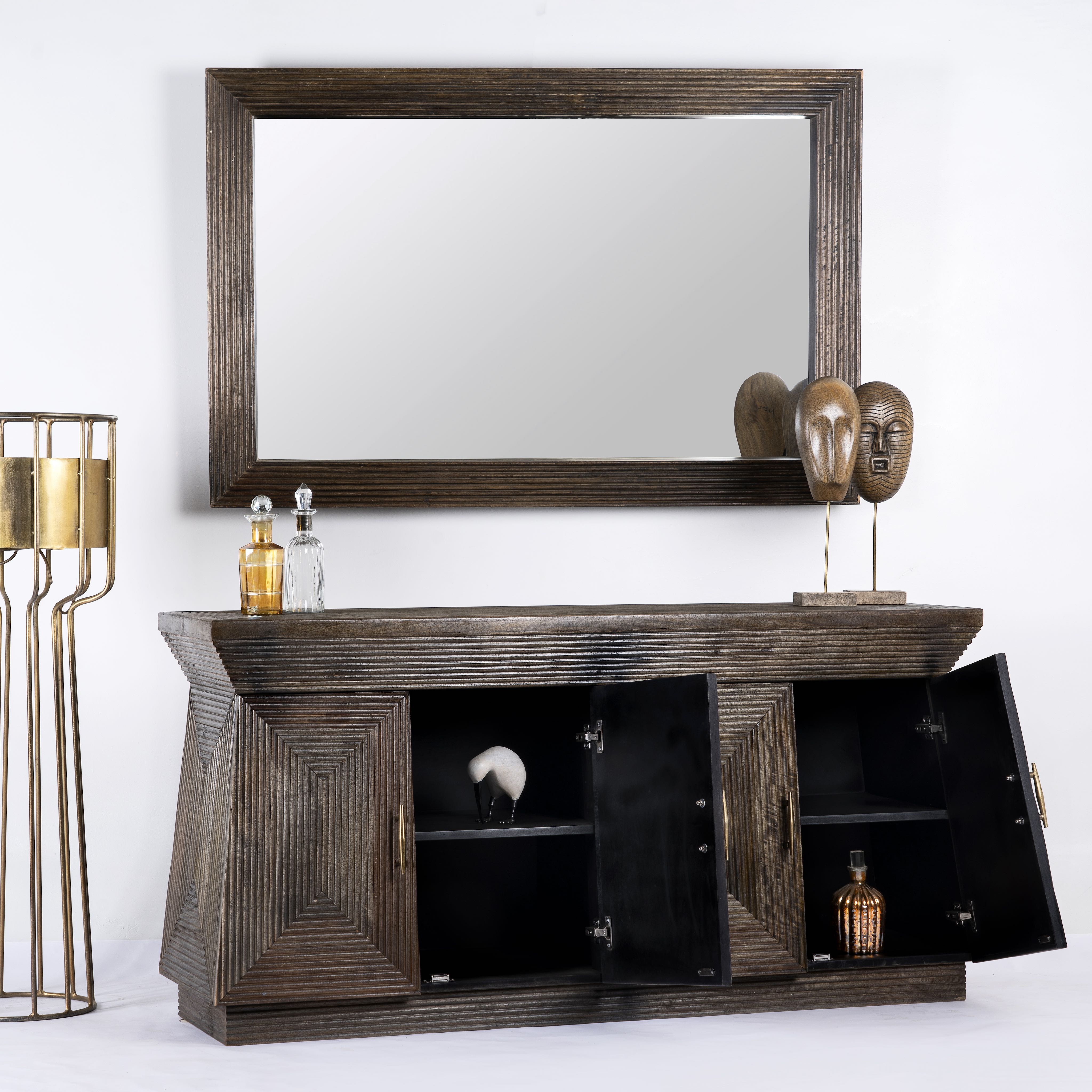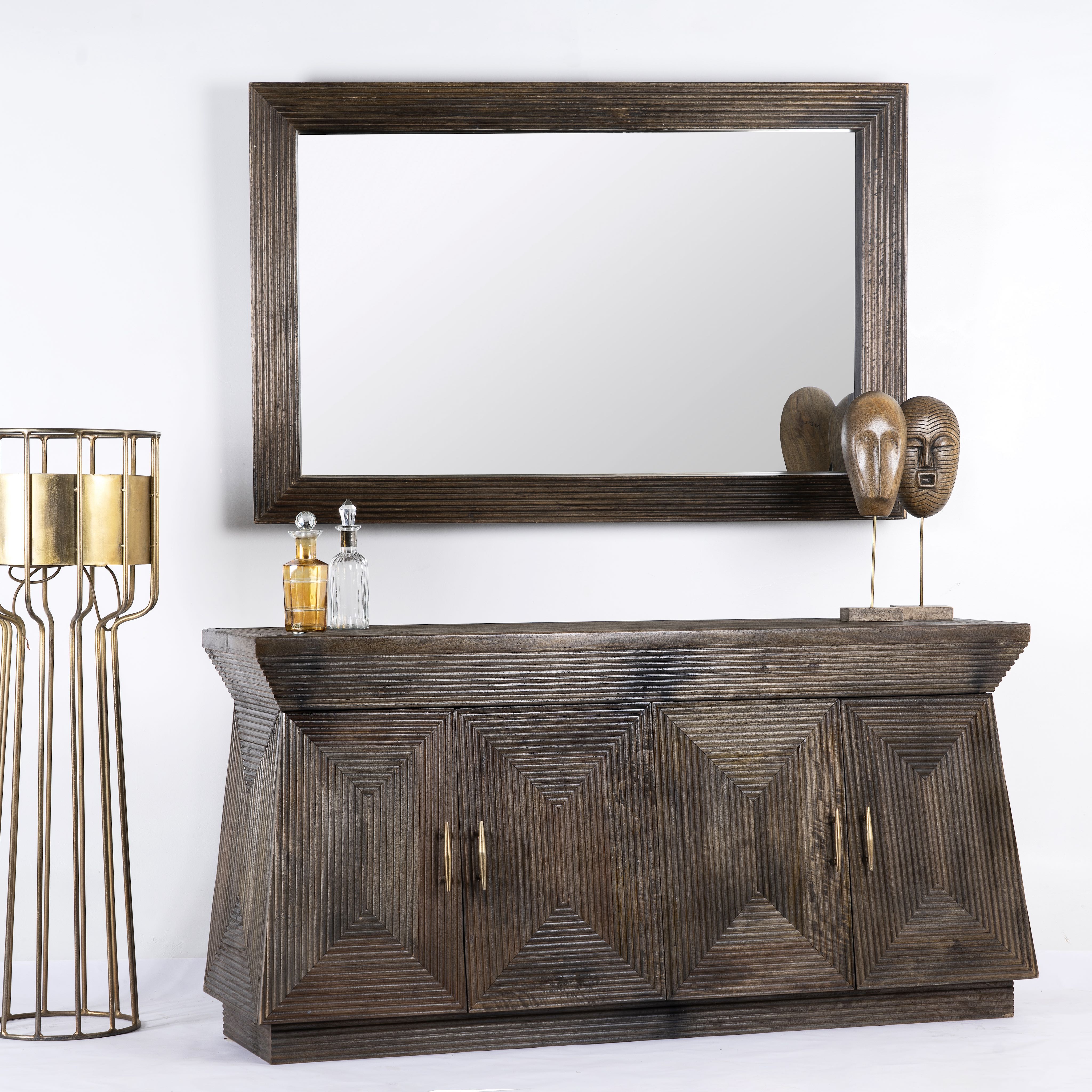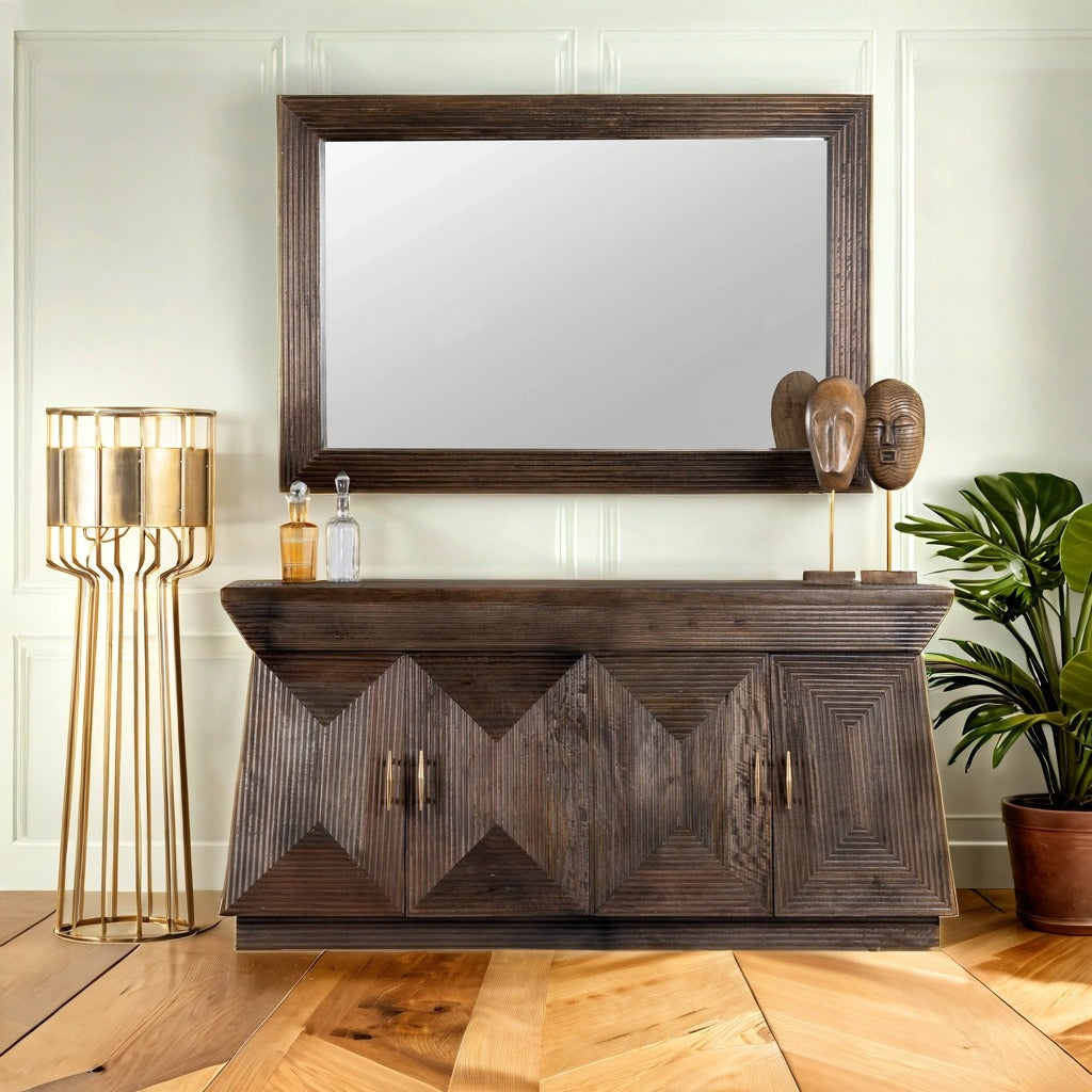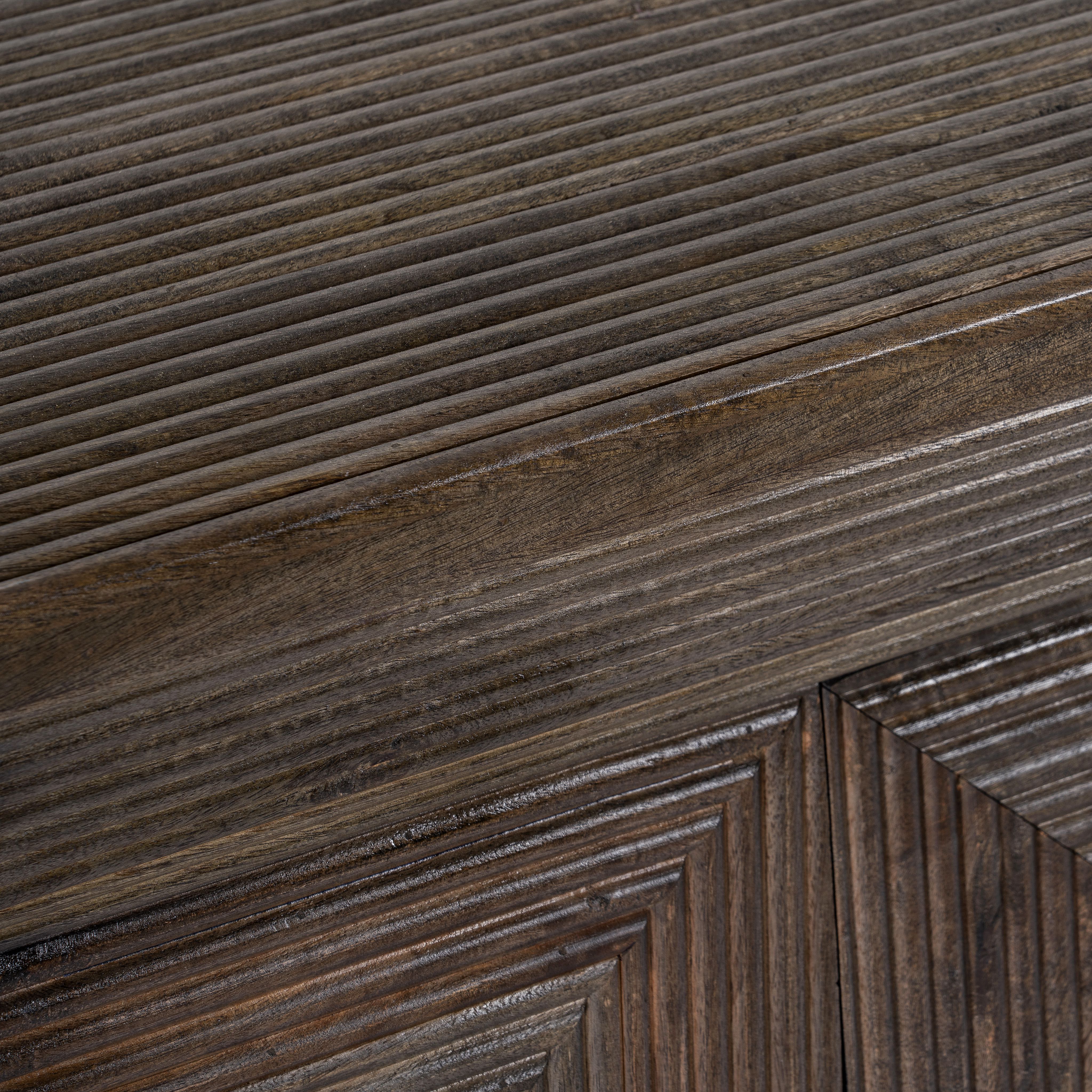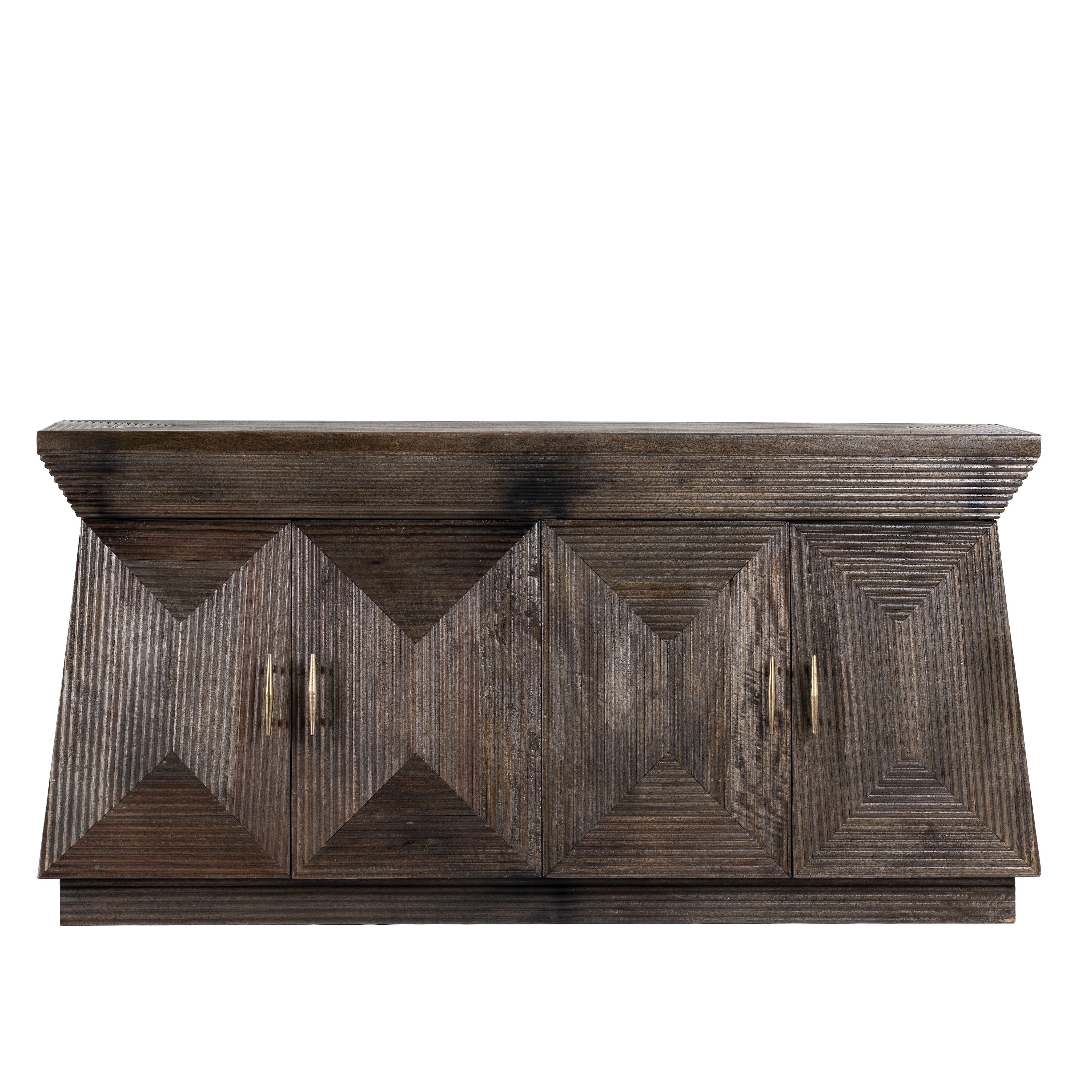 Dieser einzigartige, pyramidenförmige Holzschrank mit vier Türen zeigt aufwendige Linienschnitzereien. Handgefertigt aus natürlichem Mangoholz wird es schnell zu einem auffälligen, trendigen Blickfang in jedem Raum.