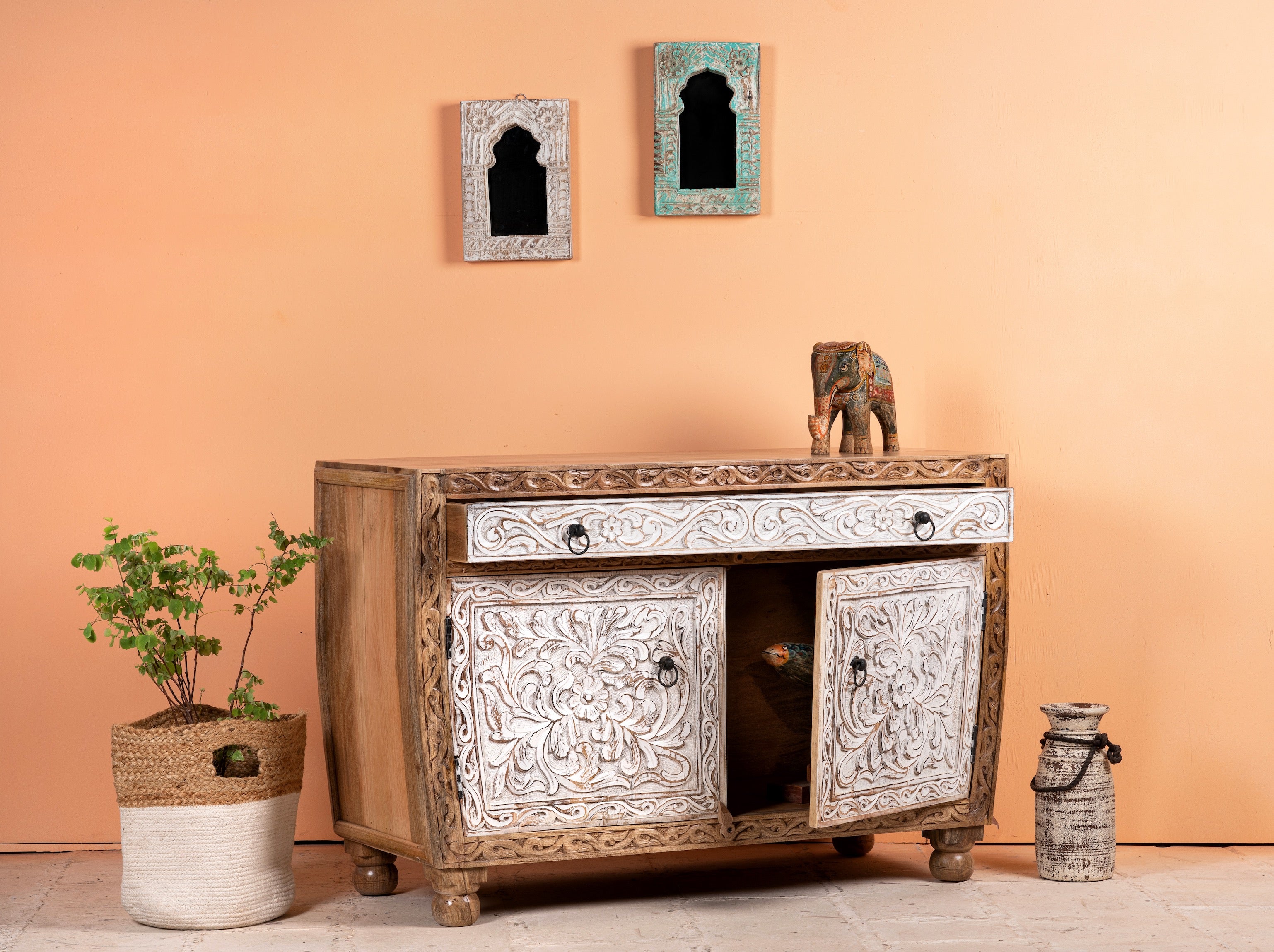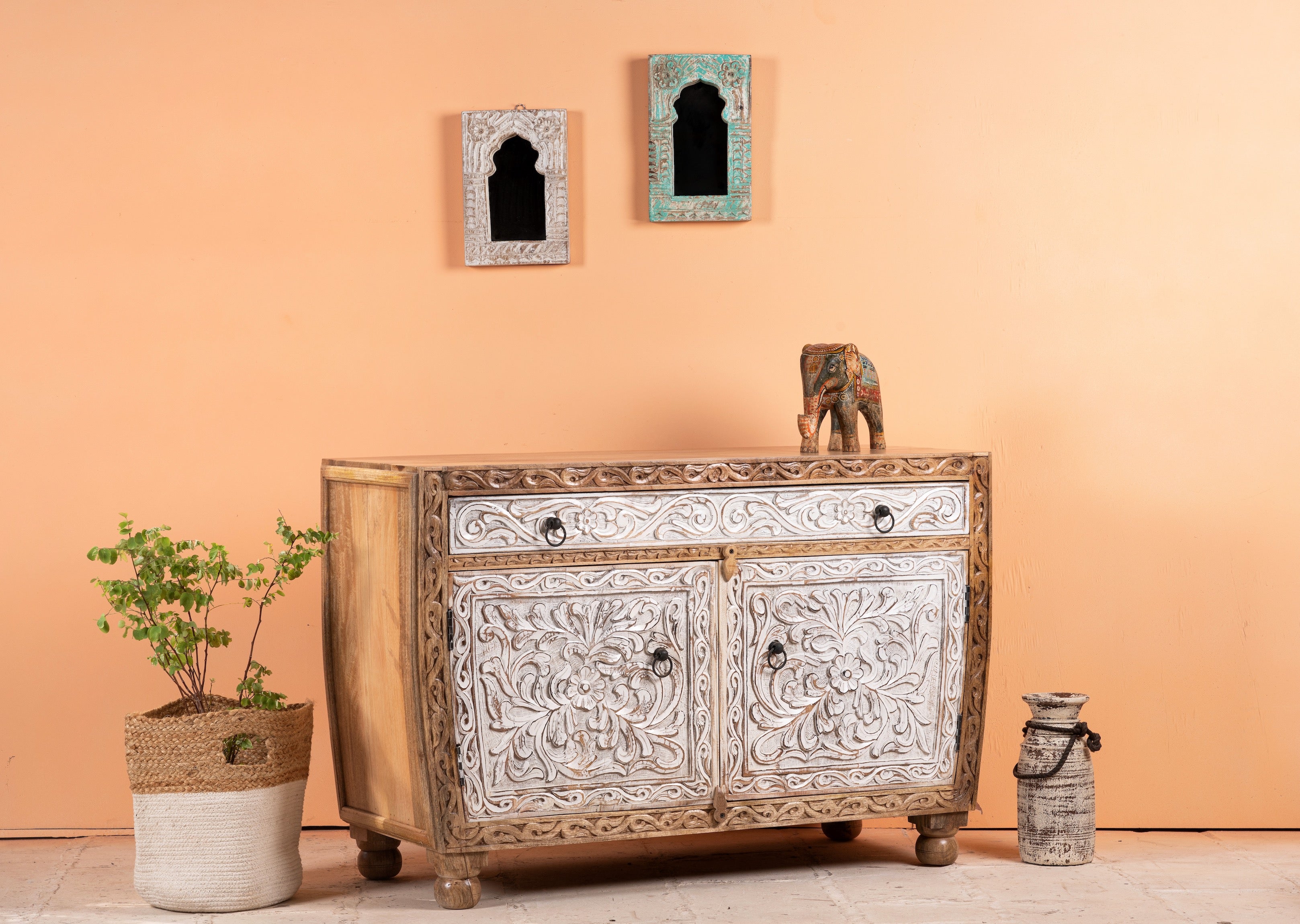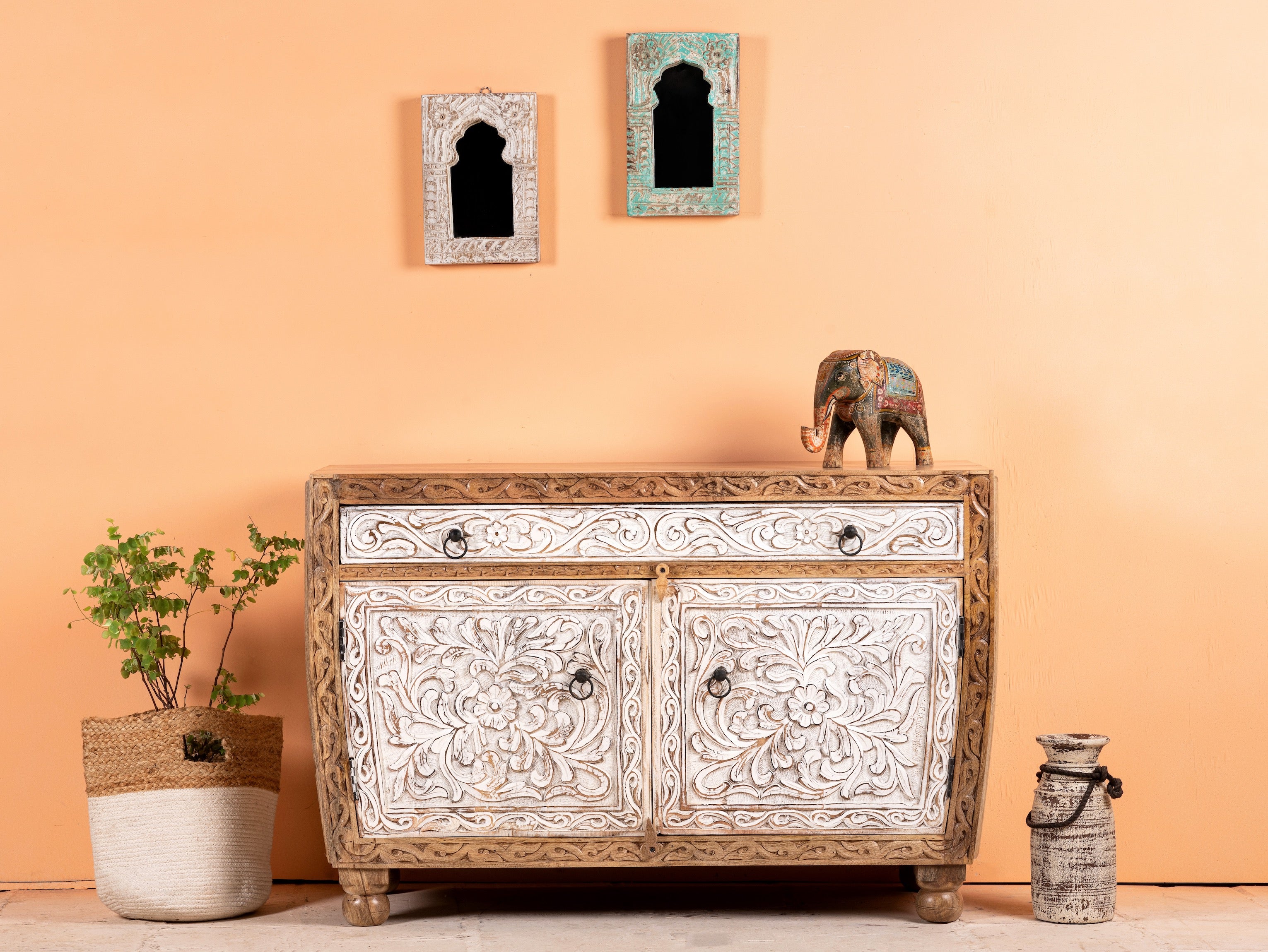 Wir präsentieren den handgefertigten indischen Schrank Sonali, eine faszinierende Mischung aus Eleganz und Funktionalität. Sein einzigartiger halbrunder Rahmen verleiht Ihrem Wohnraum einen Hauch von Raffinesse, während die weiß getünchten Schubladen und Türen ein Gefühl von Ruhe und Gelassenheit vermitteln.