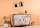 Der aus natürlichem Mangoholz gefertigte Schrank unterstreicht die Schönheit seiner satten und warmen Farbe und schafft ein harmonisches Gleichgewicht zwischen den weiß getünchten Akzenten und dem natürlichen Holzrahmen.