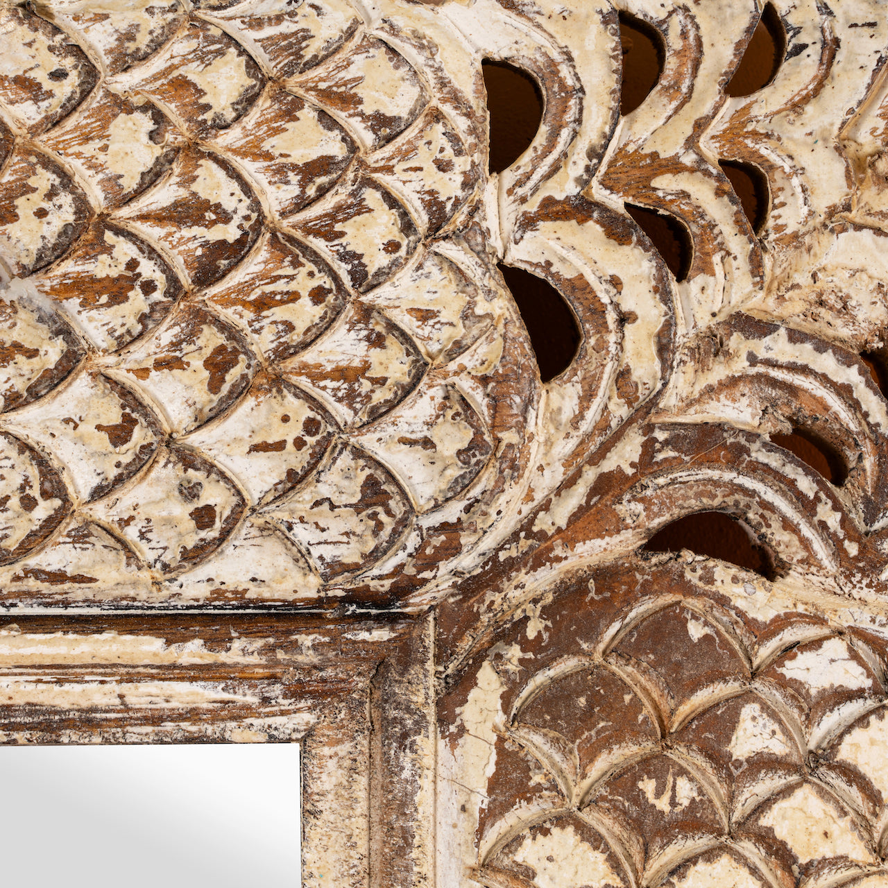 Einführung der  Apasmara-Spiegel, ein atemberaubendes Beispiel indischer Handwerkskunst. Dieser Spiegel ist weiß getüncht und vermittelt ein Gefühl von Eleganz und Schlichtheit. Was ihn auszeichnet, sind die aufwendigen handgeschnitzten Gravuren, die die Kunstfertigkeit indischer Handwerker widerspiegeln. Der  Apasmara  Spiegel verleiht Ihrem Wohnraum Charakter und kulturelle Tiefe. Werten Sie Ihre Einrichtung mit diesem einzigartigen und faszinierenden Spiegel auf, der mühelos Stil und Tradition verbindet und gleichzeitig die Essenz Indiens in Ihr Zuhause bringt.