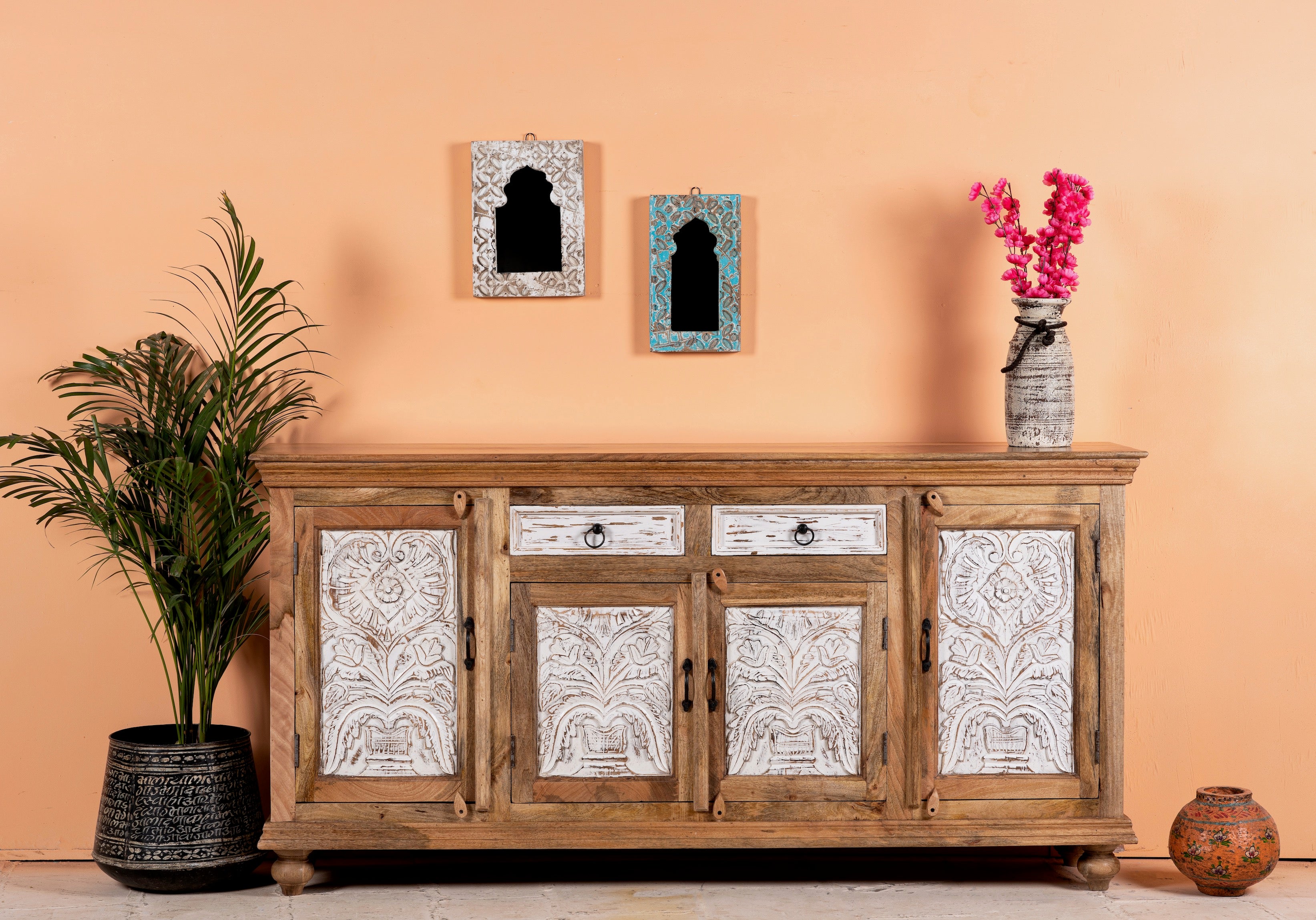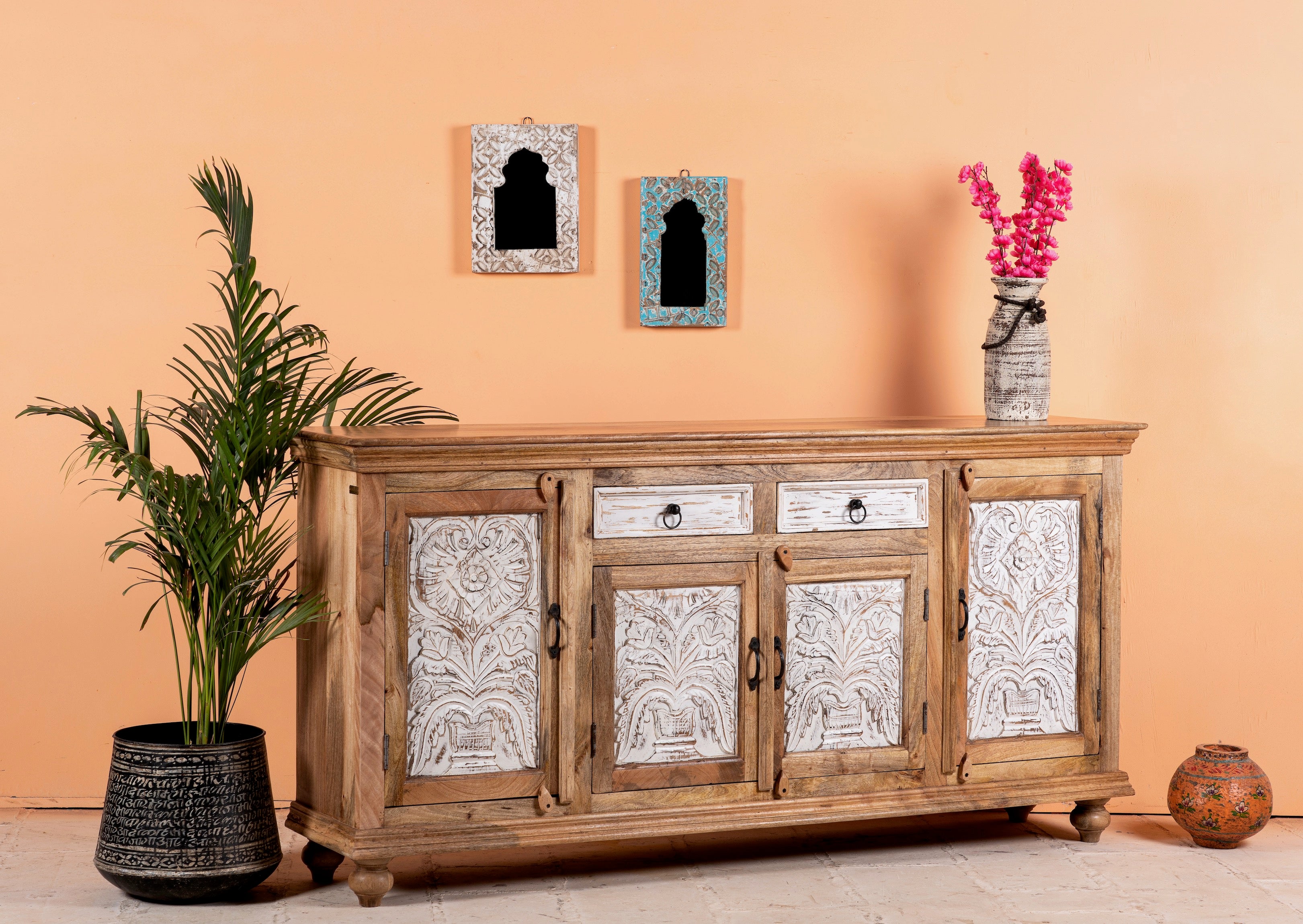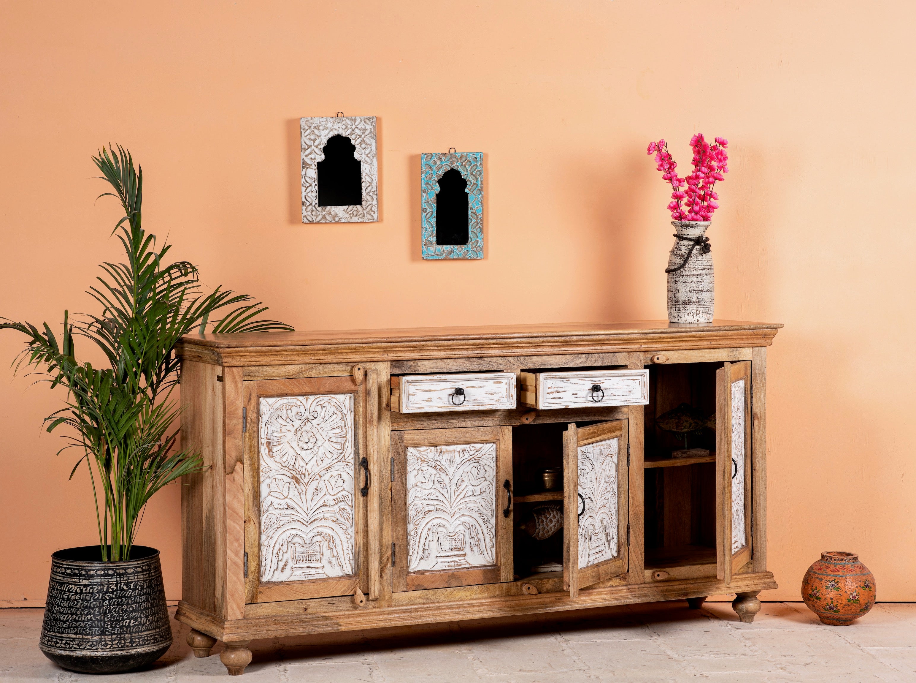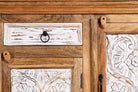 Die gravierten Türen des Sideboards zeigen komplizierte Muster und Designs, die die sorgfältige Kunstfertigkeit indischer Handwerker widerspiegeln. Jedes Detail ist sorgfältig von Hand gefertigt und schafft eine faszinierende visuelle Darstellung, die mit Sicherheit Eindruck macht.