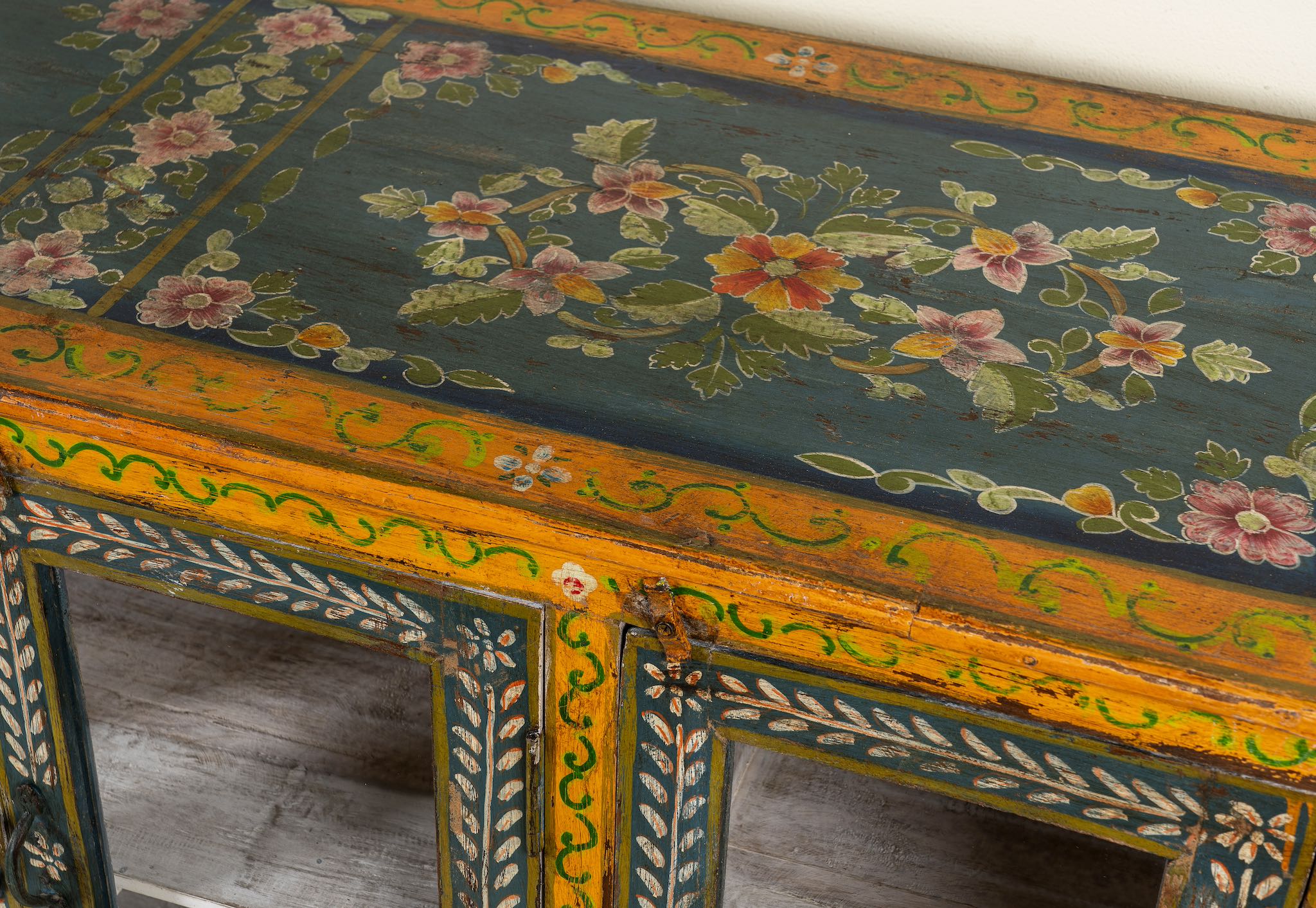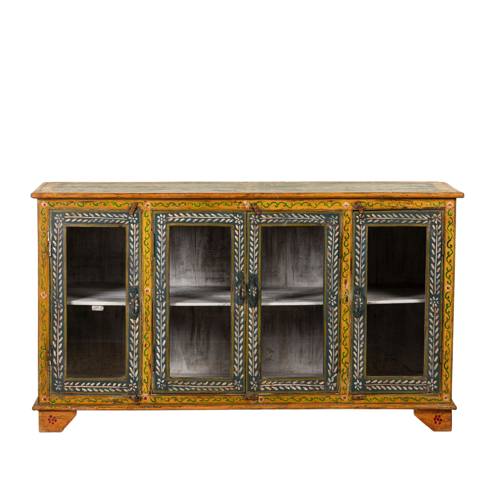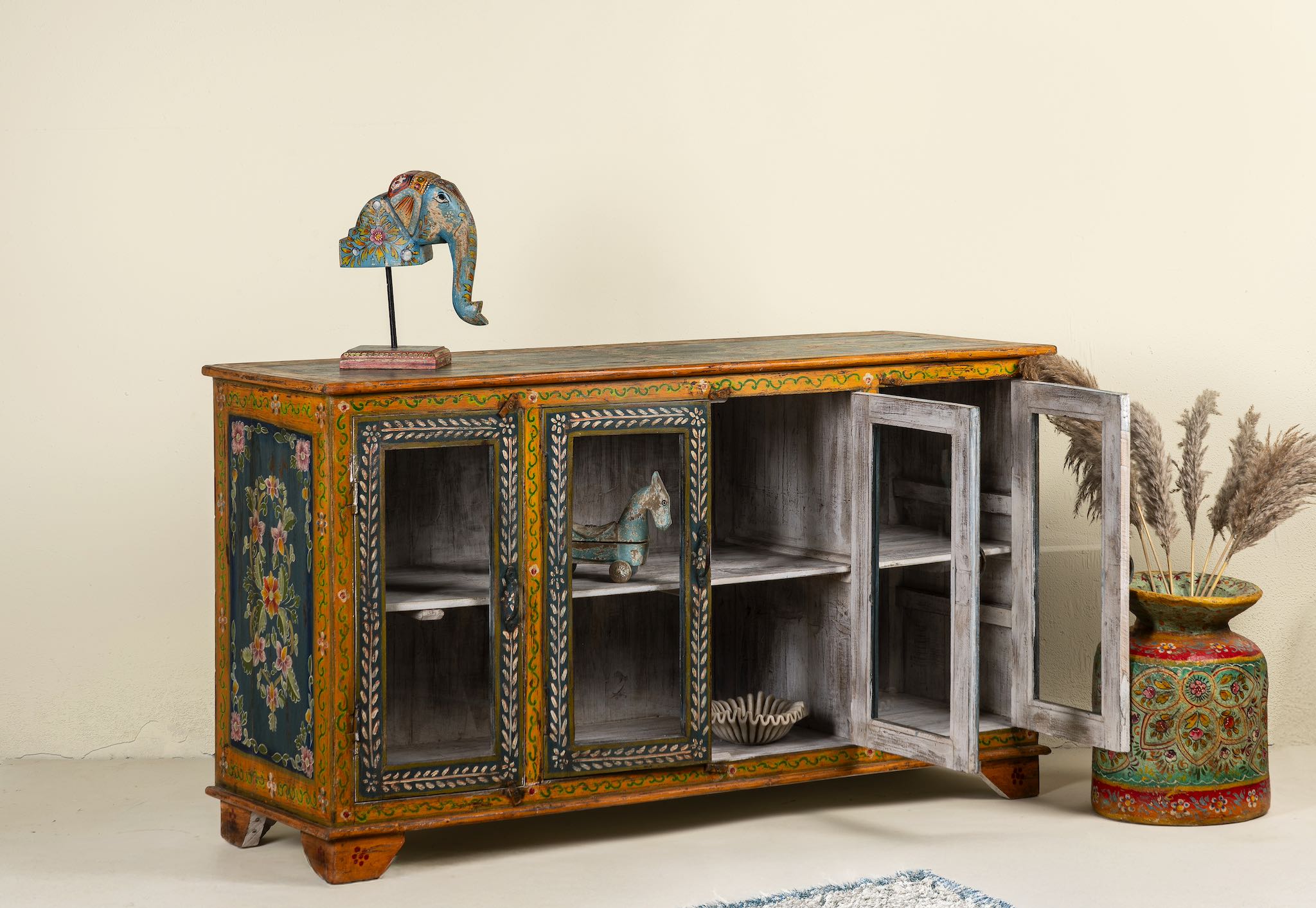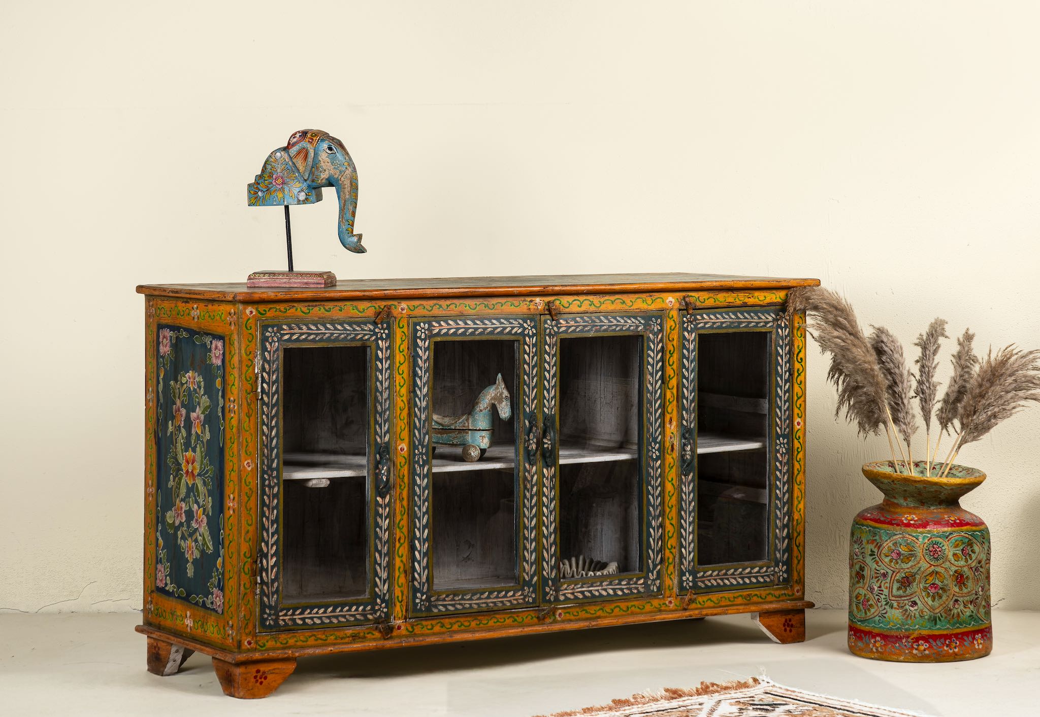 Bringen Sie lebendige Kunstfertigkeit und nachhaltige Handwerkskunst in Ihr Zuhause mit unserem atemberaubenden handbemalten Sideboard Crayon aus wiederverwertetem Teakholz. Dieses Stück ist perfekt, um jedem Raum Charakter und Funktionalität zu verleihen, und verbindet traditionelle indische Kunstfertigkeit mit modernem Nutzen.