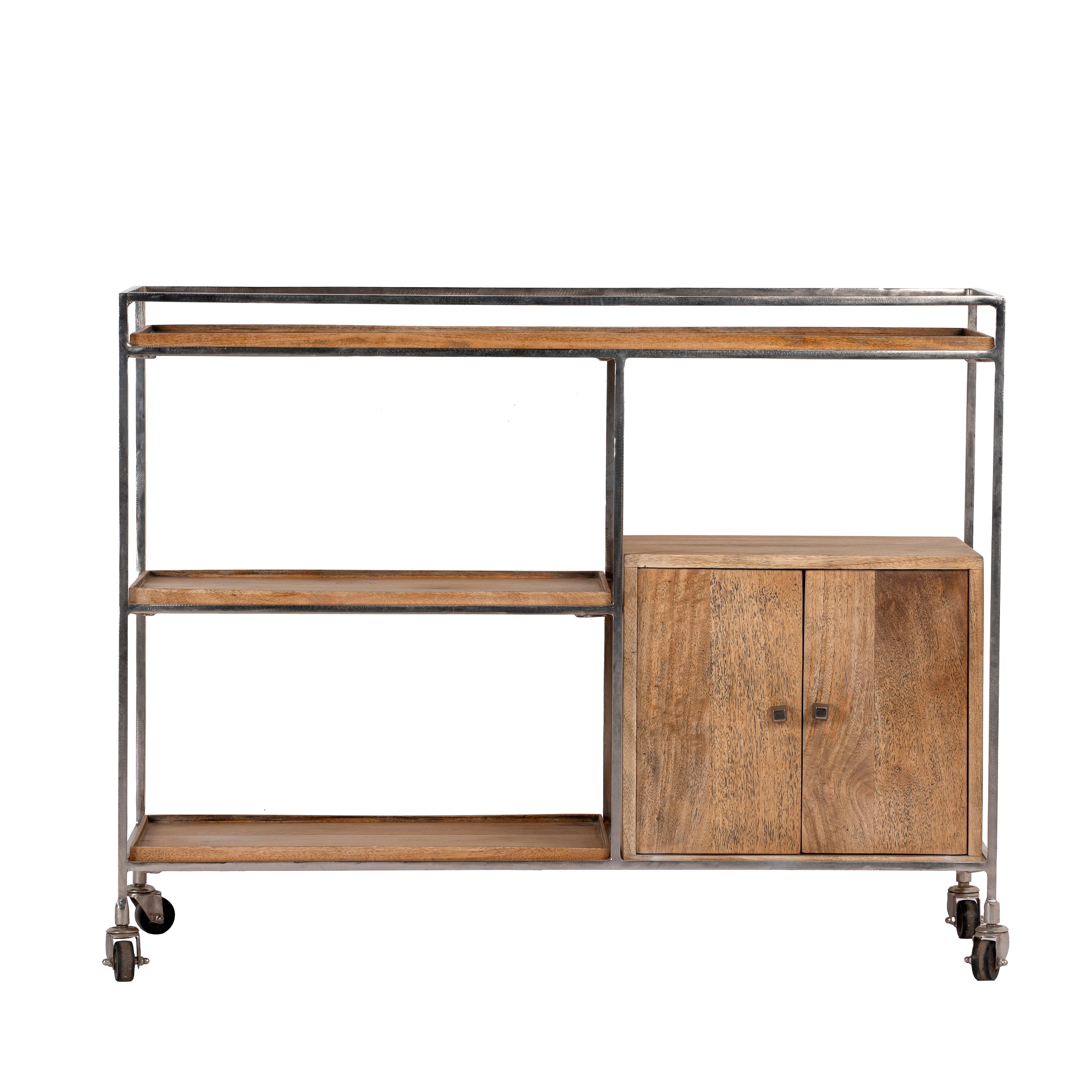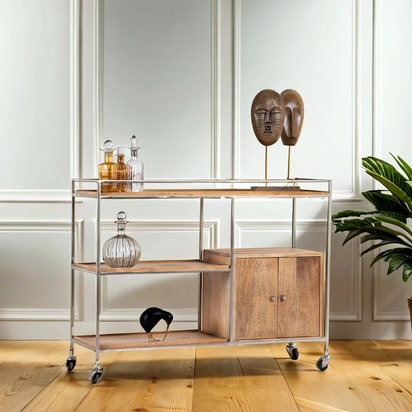 Mit seinen leichtgängigen Rollen lässt sich der Barwagen mühelos durch den Raum bewegen, sodass Sie Ihre Gäste überall stilvoll bedienen können. Das elegante silberfarbene Gestell in Kombination mit den warmen Holztönen der Serviertabletts macht diesen Wagen zu einem echten Hingucker in jedem Wohnraum.