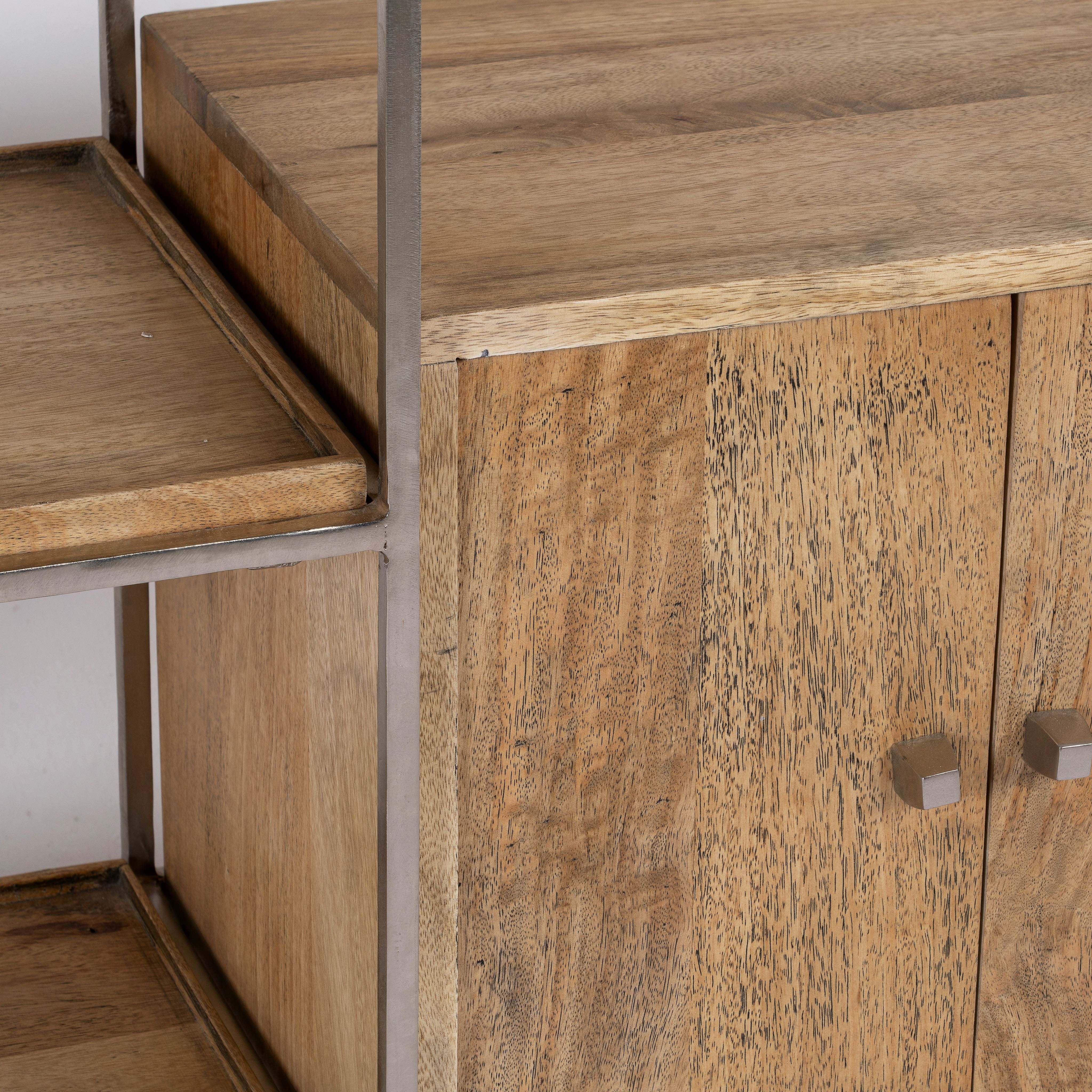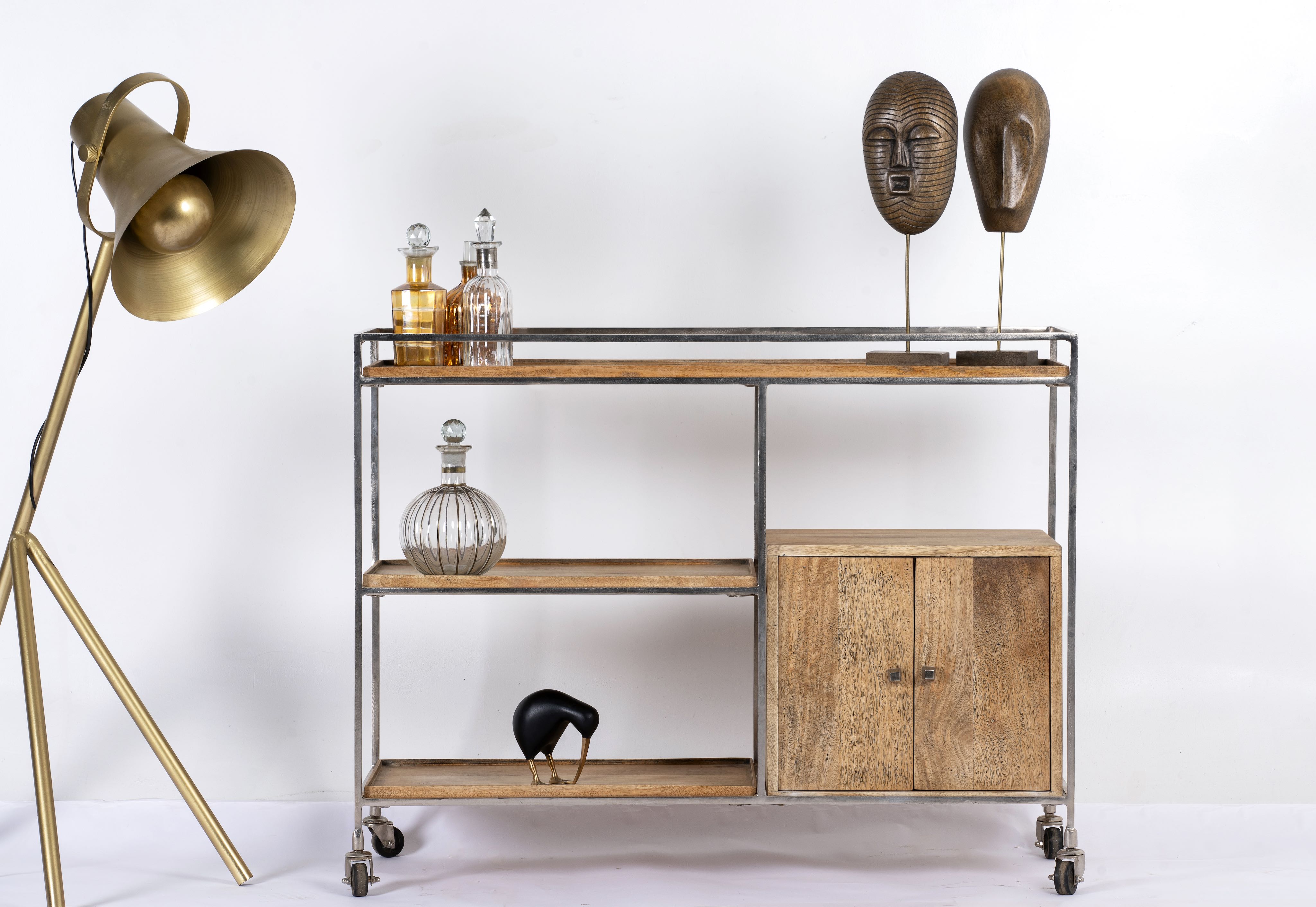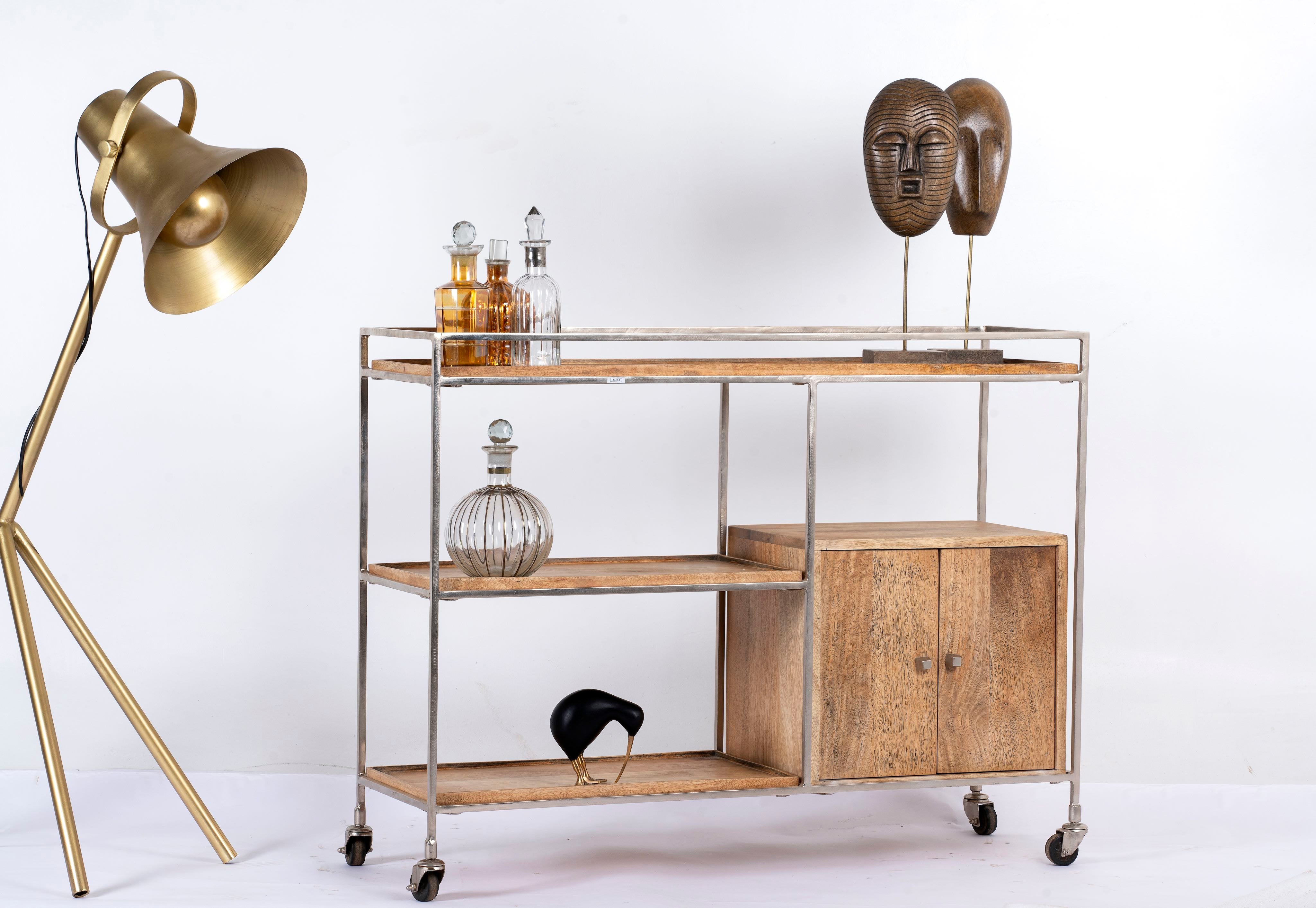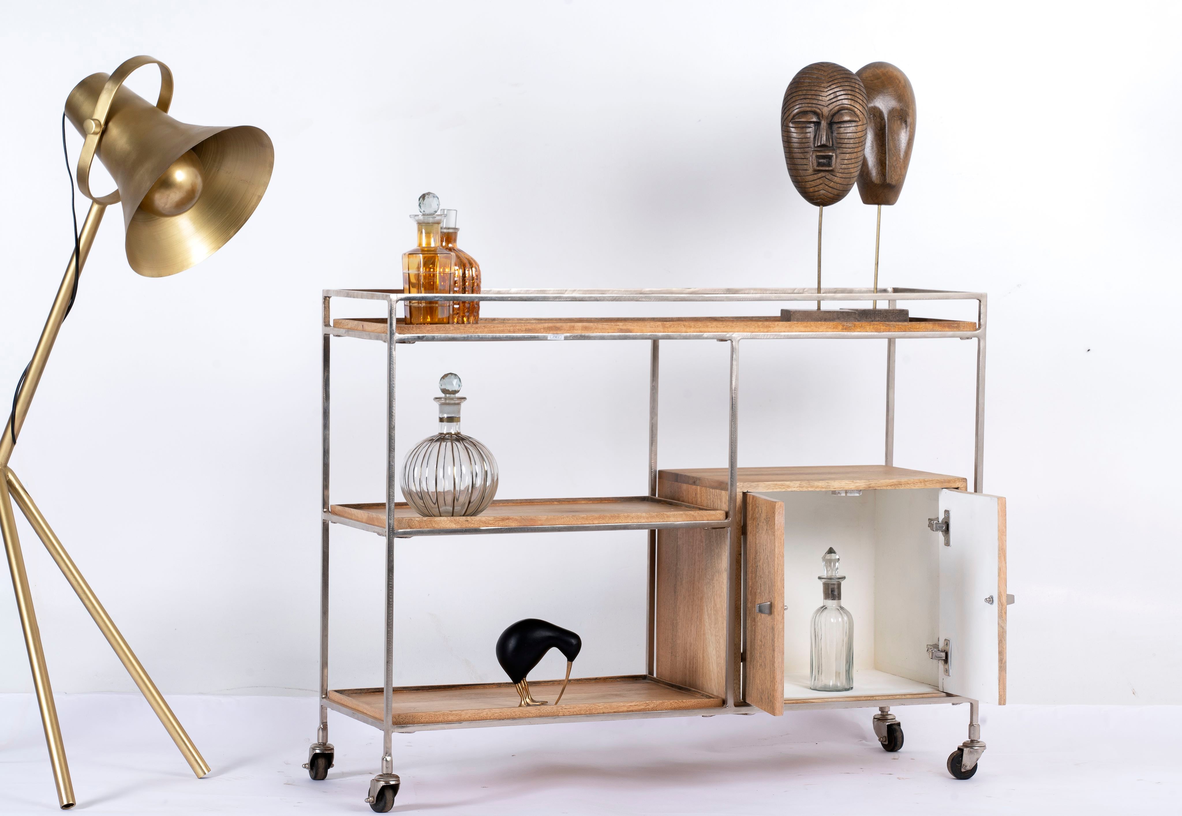 Die Serviertabletts aus natürlichem Mangoholz bieten einen warmen, organischen Gegenpart zum kühlen Metallrahmen. Jede Platte wurde sorgfältig gefertigt, um die natürliche Schönheit und Maserung des Mangoholzes hervorzuheben und gleichzeitig einen stabilen und sicheren Platz für Getränke, Gläser und Barzubehör zu bieten.