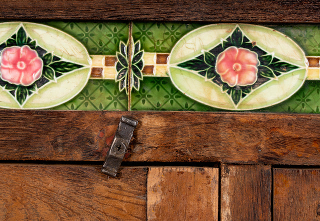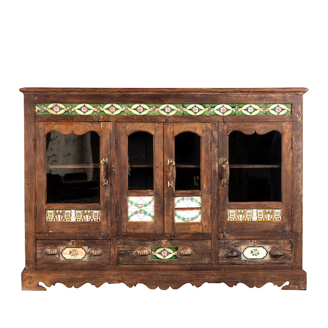 Diese antike Vitrine aus Teakholz aus Südindien ist ein schönes Beispiel für den portugiesischen Stileinfluss im Design. Die Vitrine zeichnet sich durch die typischen Keramikeinlagen aus, die ihr ein einzigartiges, farbenfrohes Aussehen verleihen. Nach einer sorgfältigen Restaurierung, bei der die Vitrine liebevoll aufgearbeitet wurde, wurde das Holz mit einer Schicht Honigwachs versiegelt. Dies sorgt nicht nur für einen tiefen, satten Glanz, sondern schützt das Holz auch vor weiterer Abnutzung. Mit seinen gewellten Kanten und dekorativen Holzschnitzereien bietet diese Vitrine eine markante Präsenz, die jedem Raum Charme und Geschichte verleiht. Sie ist ein Blickfang, der Funktionalität mit Tradition und Kunstfertigkeit verbindet.