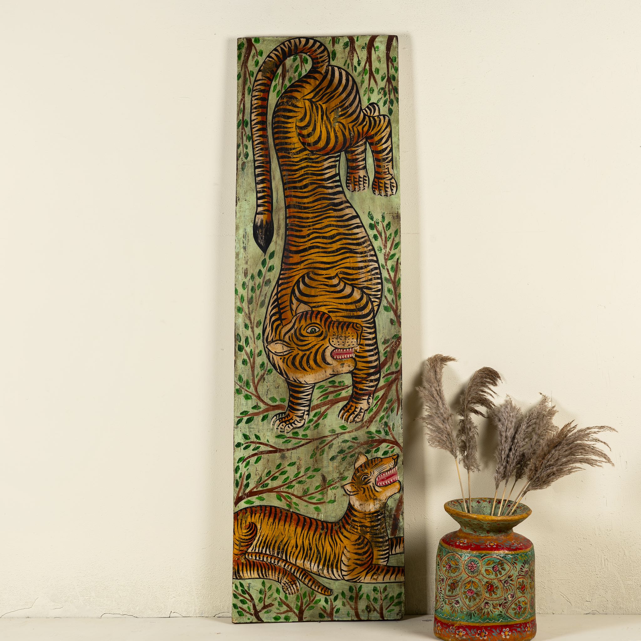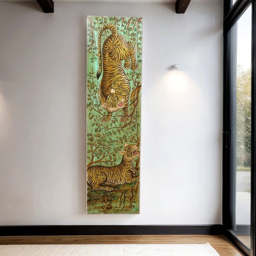 VACHAPATI - Massive Teak -handgemalte Wandtafel mit Tiger 196cm
